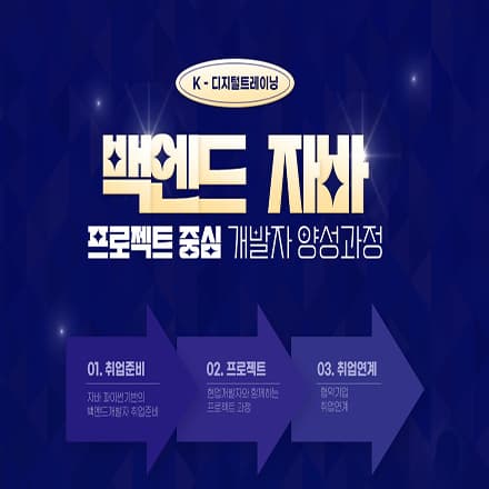 [KIC캠퍼스-한국아이티전문강사협동조합] 훈련과정 : [프로젝트중심] 백엔드 자바 웹 개발자 양성과정 훈력자격 : 전공무관, 취업준비생, 재학생(방통대,야간대), 졸업까지 남은 수업연한이 2년 이내인 대학생 또는 졸업생 교육일정 : 2023년 06월 30일 \~ 2023년 12월 04일 (5개월) 교육시간 : 09:00 \~ 18:00(주5일수업. 일일8시간. 5개월/총840시간) 교육지점 : KIC교육센터 강남지점 교육비용 : 전액무료교육(국가기간.전략산업훈련과정) 훈련수당 : 훈련장려금 300,000원 + 추가 훈련장려금 284,000원 교육문의 : 02-703-0156 / ocm7607@naver.com
