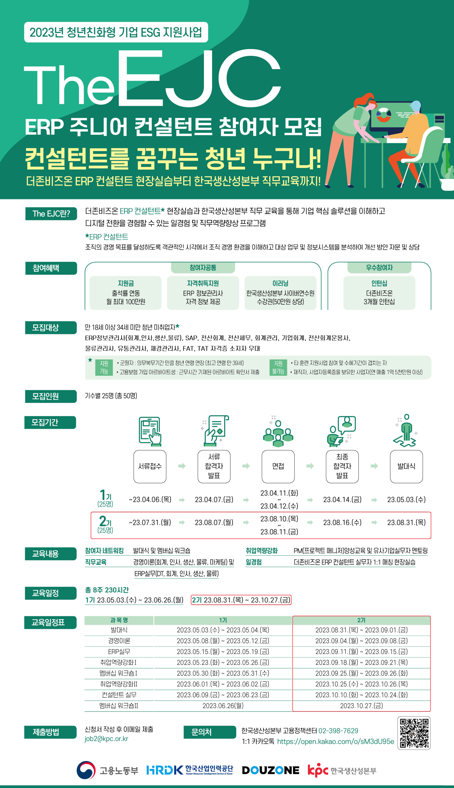 ● The EJC(ERP 주니어 컨설턴트) 더존비즈온 ERP 컨설턴트* 현장실습과 한국생산성본부 직무 교육을 통해 기업 핵심 솔루션을 이해하고 디지털 전환을 경험할 수 있는 일경험 및 직무역량향상 프로그램 *ERP 컨설턴트란? 조직의 경영 목표를 달성하도록 객관적인 시각에서 조직 경영 환경을 이해하고 대상 업무 및 정보시스템을 분석하여 개선 방안 자문 및 상담 ● 참여혜택 - 지원금 : 출석률 연동 월 최대 100만원 - 자격취득지원 : ERP 정보관리사 자격 정보 제공 - 이러닝 : 한국생산성본부 사이버연수원 수강권 (50만원 상당) - 우수참여자 더존비즈온 3개월 인턴십 ● 지원자격 - 만 18세 이상 34세 미만 청년 미취업자 - ERP정보관리사(회계\,인사\,생산\,물류)\, SAP\, 전산회계\, 전산세무\, 회계관리\, 기업회계\, 전산회계운용사\, 물류관리사\, 유통관리사\, 재경관리사\, FAT\, TAT 자격증 소지자 우대 - 군필자: 의무복무기간만큼 청년 연령 연장(최고 연령 만 39세) - 고용보험 가입 아르바이트생: 근무시간 기재된 아르바이트 확인서 제출 ※지원 불가능 - 타 훈련 지원사업 참여 및 수혜기간이 겹치는 자 - 재직자\, 사업자등록증을 보유한 사업자(연매출 1억 5천만 원 이상) ● 모집인원 - 25명 ● 모집기간 - 2023.07.31.(월) 18:00까지 ● 교육일정 및 장소 - 2023.08.31 \~ 2023.10.27 (총 8주\, 230시간) - 서울(더존비즈온 을지타워 등) ● 교육내용 - 참여자 네트워킹 : 발대식 및 멤버십 워크숍 - 직무교육 : 경영이론(회계\,인사\,생산\,물류\,마케팅) 및 ERP 실무(DT\,회계\,인사\,생산\,물류) - 취업역량강화 : PM(프로젝트 매니저)양성교육 및 유사기업실무자 멘토링 - 일경험 : 더존비즈온 ERP 컨설턴트 실무자 1:1 매칭 현장실습 ● 지원방법 - 지원서 작성 후 이메일 (job2@kpc.or.kr) 제출
