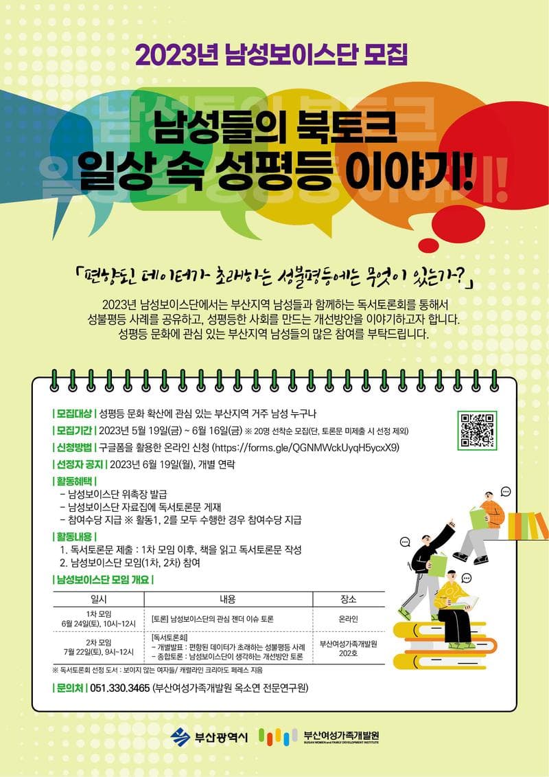 2023년 남성보이스단에서는 부산지역 남성들과 함께하는 독서토론회를 통해서 성불평등 사례를 공유하고, 성평등한 사회를 만드는 개선방안을 이야기하고자 합니다. 성평등 문화에 관심 있는 부산지역 남성들의 많은 참여를 부탁드립니다. ▢ 모집대상 - 성평등 문화 확산에 관심 있는 부산지역 거주 남성 누구나 ▢ 모집기간 : 2023년 5월 19일(금) \~ 6월 16일(금) ※ 20명 선착순 모집(단, 토론문 미제출 시 선정 제외) ▢ 신청방법 : 구글폼을 활용한 온라인 신청 (https://forms.gle/QGNMWckUyqH5ycxX9) ▢ 선정자 공지 : 2023년 6월 19일(월), 개별 연락 ▢ 활동혜택 - 남성보이스단 위촉장 발급 - 남성보이스단 자료집에 독서토론문 게재 - 참여수당 지급 ※ 활동1,2를 모두 수행한 경우 참여수당 지급 ▢ 활동내용 1. 독서토론문 제출 : 1차 모임 이후, 책을 읽고 독서토론문 작성 2. 남성보이스단 모임(1차, 2차) 참여 ▢ 남성보이스단 모임 개요