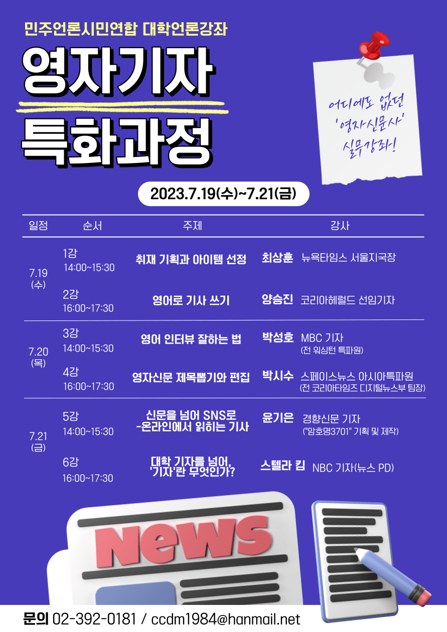 민주언론시민연합이 2023년 7월 19일(수)부터 21일(금)까지 2023 여름 대학언론강좌 영자기자 특화과정을 개최합니다. 특화과정은 대학언론 영자기자 맞춤형 실무 교육으로 마련됐습니다. 취재 기획과 아이템 선정, 영어 기사 쓰기, 영어 인터뷰, 영자신문 제목뽑기와 편집, SNS 기사 작성 등 취재부터 기사 작성·편집까지 6회에 걸쳐 국문 기사와 차별점을 갖는 영문 기사 실무 중심으로 교육이 진행됩니다. 또한 대학언론을 넘어 저널리즘에 대해 함께 고민하는 시간도 가져봅니다. 강사로는 외신, 영자지, 해외 특파원 등 다양한 분야에서 활약하는 현직 언론인이 나섭니다. ▲최상훈 뉴욕타임스 서울지국장 ▲양승진 코리아헤럴드 선임기자 ▲박성호 MBC 전 워싱턴 특파원 ▲박시수 스페이스뉴스 아시아특파원 ▲윤기은 경향신문 기자 ▲스텔라 킴 NBC 기자가 그 주인공입니다. 영자신문 언론인으로 보다 많은 애로사항을 갖고 있던 대학언론인들의 많은 관심과 참여를 바랍니다.
