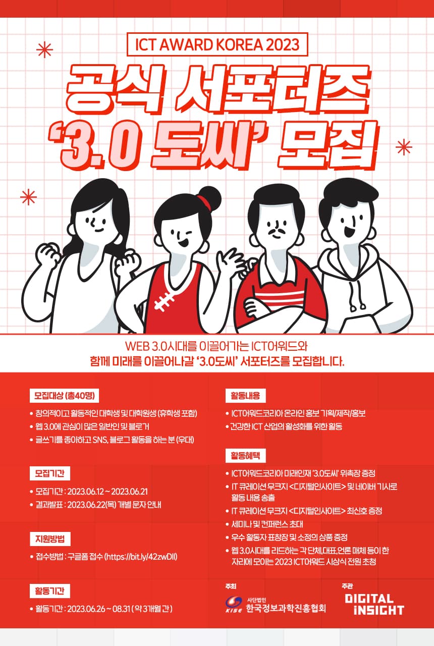 WEB 3.0시대를 이끌어가는 ICT어워드와 함께 미래를 이끌어나갈 '3.0도씨' 서포터즈 모집이 진행되니 많은 지원과 관심바랍니다.
