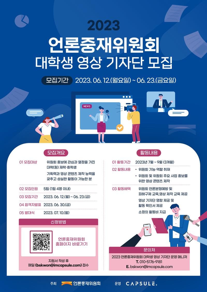 2. 영상 기자단 모집 안내 가. 모집기간 : 2023년 6월 12일(월) \~ 23일(금) 17:00까지 (2주간) 나. 모집인원 : 5팀(1팀 4명 이내) / 1인 지원 불가 다. 활동기간 : 2023년 7월 \~ 9월(3개월) 라. 모집대상 - 위원회 홍보에 관심과 열정을 가진 2023년 6월 현재 대학(원)에 재학·휴학 중인 학생으로 기획력과 영상 콘텐츠 제작 능력을 갖추고 성실한 활동이 가능한 자 마. 선발방법 : 서류심사 (<별첨> 2023년 언론중재위원회 대학생 영상기자단 지원서 심사) ※ 영상 기자단 참여의지, 위원회 이해도, 콘텐츠 제작 역량 등 다양한 요소를 종합 평가 바. 합격자 발표 : 2023년 6월 30일(금)(예정) ※ 위원회 홈페이지 공지 및 합격자에게 개별 통보 사. 영상 기자단 발대식 : 2023년 7월 10일(월)(예정), 시간 및 장소 추후 공지