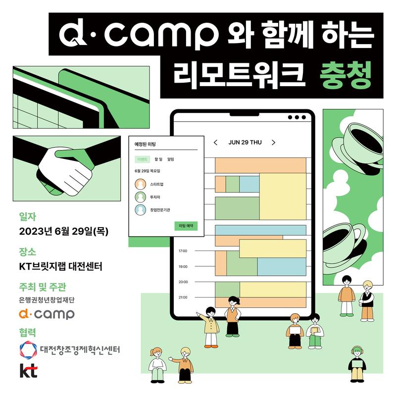 [신청 안내] 일시 \| 6월 29일(목) 10:00\~20:00 └ 리모트워크 10:00\~17:30 / 네트워킹 17:30\~20:00 장소 \| KT브릿지랩 대전센터 상세 내용 \| https://dcamp.kr/event/45993 신청 링크(\~6/27\, 화) \| https://forms.gle/GZD5aqDeJgFhJqpQ9 * 6/22(목)부터 선정자 안내 예정입니다.