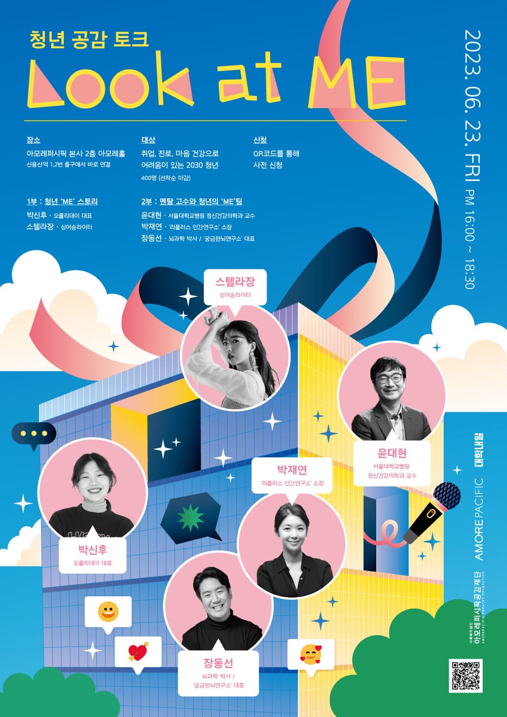 아모레퍼시픽공감재단은 취업, 진로고민 등 청년 세대의 다양한 고민과 회복 스토리를 나누고, '마음 건강' 유지 방법 등을 함께 이야기하는 'Look at ME: 청년 공감 토크'를 진행합니다. 1)일시: 6월 23일(금) 오후4\~6시 30분 2)장소: 아모레퍼시픽 본사 2층 아모레 홀 3)프로그램 세션1: 청년 'ME'스토리 (연사: 박신후 오롤리데이 대표, 스텔라장) 세션2: 멘탈 고수들과 청년들의 'ME'팅 (패널: 윤대현 박사, 박재연 소장, 장동선 박사) 4)대상: 선착순 250명 (모두 선착순 마감) *본 접수 기간: 6월 12일(월) 오전10시\~16일(금) 오후4시까지 *발표: 6월 16일(금) 오후 5시 이후