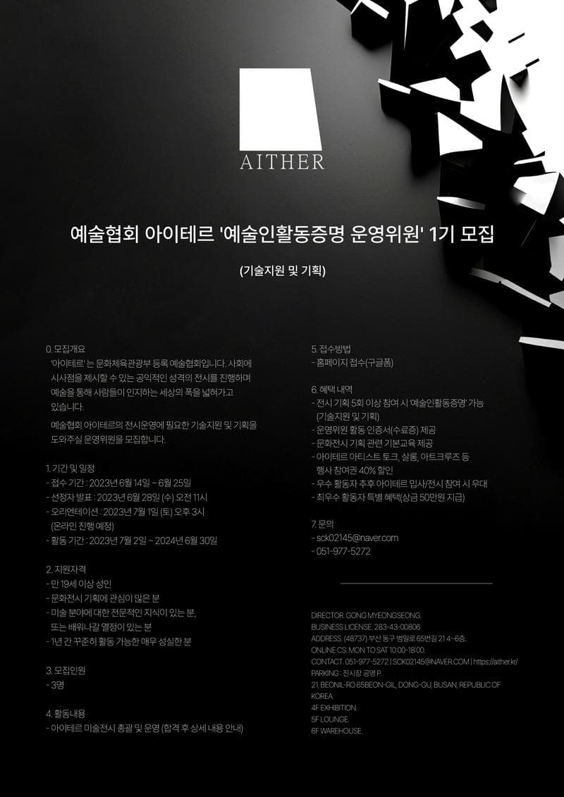 0. 모집개요 '아이테르' 는 문화체육관광부 등록 예술협회입니다. 사회에 시사점을 제시할 수 있는 공익적인 성격의 전시를 진행하며 예술을 통해 사람들이 인지하는 세상의 폭을 넓혀가고 있습니다. 예술협회 아이테르의 전시운영에 필요한 기술지원 및 기획을 도와주실 운영위원을 모집합니다. 1. 기간 및 일정 - 접수 기간 : 2023년 6월 14일 \~ 6월 25일 - 선정자 발표 : 2023년 6월 28일 (수) 오전 11시 - 오리엔테이션 : 2023년 7월 1일 (토) 오후 3시 (온라인 진행 예정) - 활동 기간 : 2023년 7월 2일 \~ 2023년 6월 30일 2. 지원자격 만 19세 이상 성인 문화전시 기획에 관심이 많은 분 미술 분야에 대한 전문적인 지식이 있는 분, 또는 배워나갈 열정이 있는 분 6개월 동안 꾸준히 활동 가능한 매우 성실한 분 3. 모집인원 - 3명 4. 활동내용 - 아이테르 미술전시 총괄 및 운영 (합격 후 상세 내용 안내) 5. 접수방법 - 홈페이지 접수(구글폼) https://docs.google.com/forms/d/e/1FAIpQLSfWOYQ5KRHwEa6W2Vc3QHTJY0n-yNngtOLAI4PHrpUQ-ZKxpQ/viewform?usp=sf_link 6. 혜택내역 - 전시 기획 5회 이상 참여 시 ‘예술인활동증명’ 가능 (기술지원 및 기획) - 운영위원 활동 인증서(수료증) 제공 - 문화전시 기획 관련 기본교육 제공 - 아이테르 아티스트 토크, 살롱, 아트크루즈 등 행사 참여권 40% 할인 - 우수 활동자 추후 아이테르 입사/아이테르 전시 참여 시 우대 - 최우수 활동자 특별 혜택(상금 50만원 지급) 7. 문의 - sck02145@naver.com - 051-977-5272