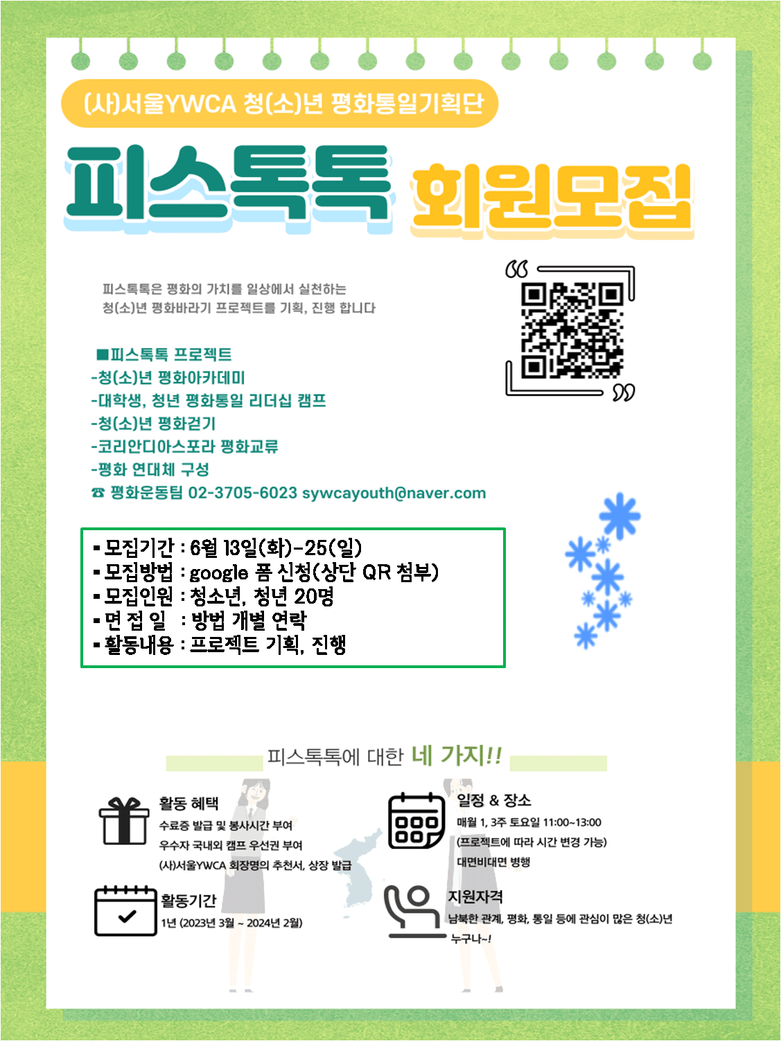 사단법인 서울YWCA에서 청(소)년 평화통일 기획단 피스톡톡 하반기 회원을 모집합니다. 국제 관계, 남북한, 해외 연수, 평화, 통일 등에 관심이 많은 청(소)년 누구나 참여 가능합니다. 많은 관심과 지원 부탁드립니다. 감사합니다:D ▶ 이전 주요 활동 내역 2015: DMZ 철원 국경선 학교 평화통일캠프 2016: 중국 연변·백두산 평화통일캠프, 청년 평화통일 라운드테이블 2017: 러시아 연해주 평화통일캠프, 평화통일리더양성 교육·워크숍 2018-2019: 일본 규슈 평화통일캠프, DMZ 평화걷기 2020: 북중러 접경지역 평화통일캠프, 평화통일세미나 2021-2022: 서울에서 분단을 마주하는 평화 캠프, 코리안디아스포라 평화교류 ▶ 피스톡톡(Peace Talk Talk) 프로젝트 - 청(소)년 평화아카데미 - 대학생, 청년 평화통일 리더십 캠프(국내·국외) - 청(소)년 평화걷기 - 코리안디아스포라 평화교류 - 평화 연대체 구성 모집기간: 6월 13일(화) - 25일(일) 모집방법: 구글폼 신청 모집인원: 청소년, 청년 20명 면접일시: 면접 방법 개별 연락 활동방법: 비대면·대면 병행 접수방법: 큐알코드 혹은 구글폼 주소 클릭하여 신청서 제출 회비 : 1년 11,000원 혜택 - 수료증 발급, 봉사시간 부여 - 우수자 국내외 캠프 우선권 부여 - 우수자 서울YWCA회장명의 추천서 발급 구글 접수 : https://forms.gle/yKZsUzt7XWNp3QSH8 홈페이지 접수 : https://www.seoulywca.or.kr/bbs/board.php?bo_table=board0306&wr_id=112 문의: 평화운동팀 (02-3705-6023 / sywcayouth@naver.com)