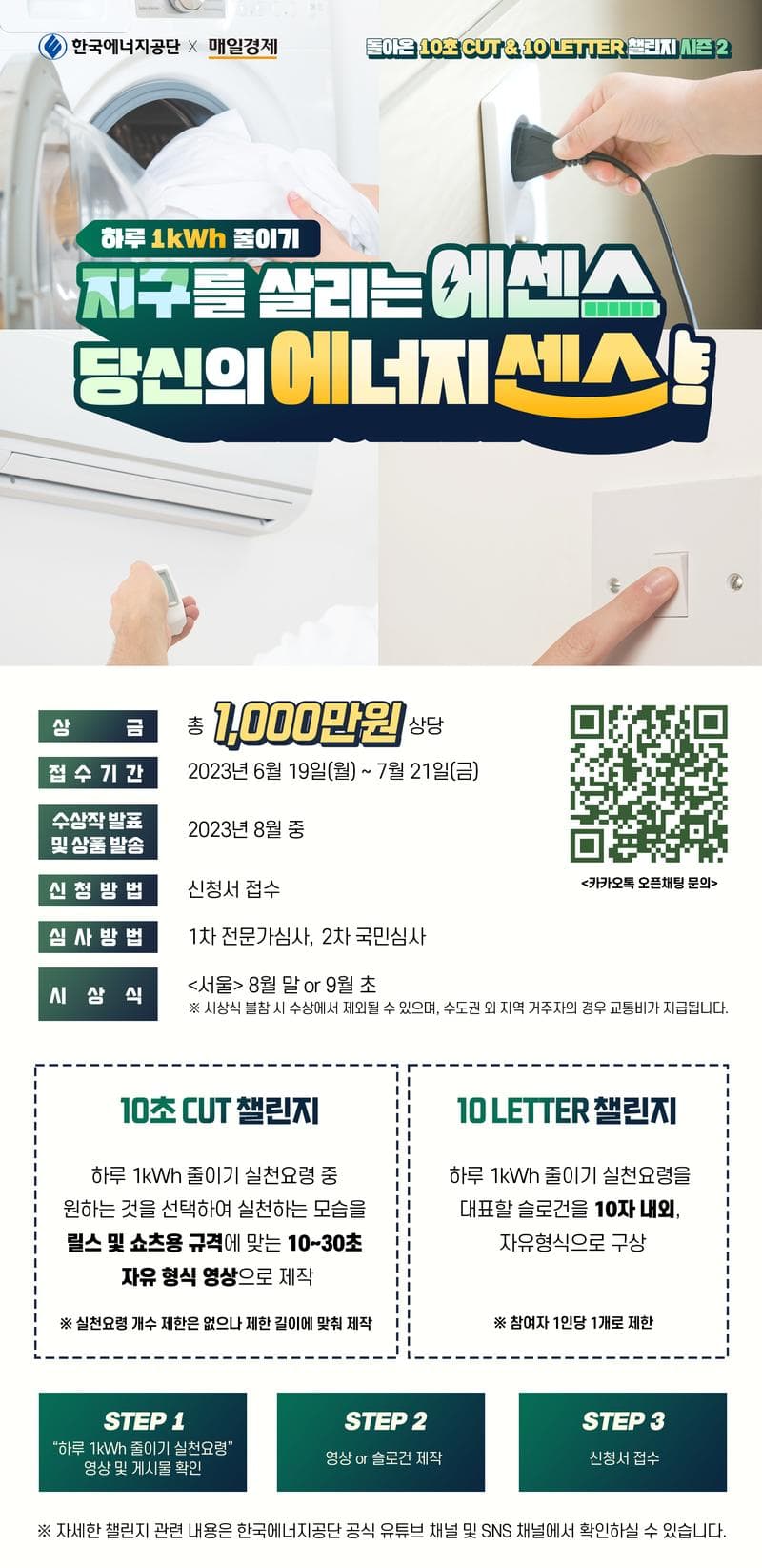 [한국에너지공단] “하루 1kWh 줄이기” 돌아온 10초 CUT & 10 LETTER 챌린지 돌아온 10초 CUT & 10 LETTER 챌린지! 지구를 살리는 에센스(E-Sens), 당신의 에너지 센스는? 쉽게! 새롭게! 나만의 1kWh 에너지 센스! 나의 공간에서는 몇 kWh를 아낄 수 있을까? 쉽고 간단하게 지켜내는 우리의 Energy! 단 3초, 누구든지 해낼 수 있어 ! 곧 맞이할 우리들의 뜨거운 여름, 나의 생활 공간 속에서 찾을 수 있는 1kWh를 지키고 똑똑하고 시원하게 여름을 지내봐요. “에너지 절약, 너의 E-Sens면 E지하지“ [하루 1kWh 줄이기 실천 요령]을 한국에너지공단 유튜브 채널 및 네이버 블로그에서 확인한 후 나만의 방법과 개성으로 숏폼 영상을 제작하거나 대표 슬로건을 구상하여 신청서를 제출하면 Clear ! “하루 1kWh 줄이기 실천요령 영상” https://www.youtube.com/watch?v=PyxCov4J0pM “하루 1kWh 줄이기 실천요령 게시물” https://vvd.bz/cbsx 접수기간 2023년 6월 19일(월) \~ 7월 21일(금) 수상작 발표 및 상품 발송 2023년 8월 중 신청방법 신청서 접수 ① 10초 CUT(영상) 챌린지 신청 링크 : https://naver.me/GfMeP9pQ ② 10 LETTER(슬로건) 챌린지 신청 링크 : https://naver.me/GHD0sjcD 챌린지 안내 지구를 살리는 나만의 에너지 센스! 에너지를 아낄 수 있는 작은 행동 하나로 1kWh를 줄일 수 있습니다. “하루 1kWh 줄이기 실천요령” 중 원하는 것을 선택하여 실천하는 모습을 숏폼 영상으로 제작하거나 대표할 슬로건를 구상하여 참여해보세요 ! TIP. 절약되는 에너지를 수치로 표현한 제작물이면 선정 확률 UP!