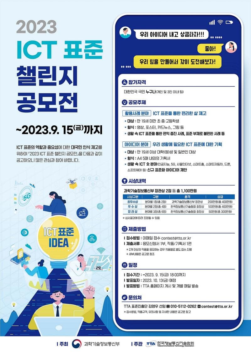 2023 ICT 표준 챌린지 공모전 ■ 공모 주제 ICT 표준의 역할과 중요성 ㅇ 활용사례 분야: ICT 표준을 통한 편리한 삶 제고 ㅇ 아이디어 분야: 우리 생활에 필요한 ICT 표준에 대한 기획 ■ 공모 내용 ㅇ 활용사례 분야: 영상, 카드뉴스, 포스터, 그림 등 ㅇ 아이디어 분야: A4 5매 이내의 기획서 ■ 지원 자격 ㅇ 활용사례 분야: 만 19세 미만 초, 중, 고등학생 ㅇ 아이디어 분야: 만 19세 이상 대학(원)생 및 일반인 ■ 모집 기간 6.12(월) \~ 9.15(금) ■ 지원 방법 이메일 접수 (contest@tta.or.kr) ■ 시상내역 과학기술정보통신부 장관상 2점 등 총 1,100만원 ■ 문의 사항 TTA 표준진흥단 김영우 선임(010-5112-0262)