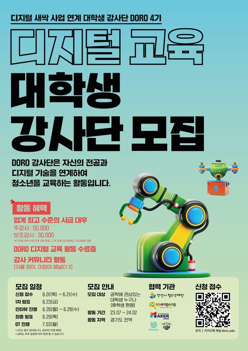 ■ 모집개요 - 방학기간 청소년 교육 기업 DORO에서 청소년들에게 디지털 기술을 전달하는 대학생 강사단을 모집하고 있어요! 청소년 교육 활동 수료증 + 업계 최고 수준의 시급대우 (최고 시급 50,000원) - 교육에 대한 관심과 책임감만 있다면 누구나 강사단이 될 수 있어요.