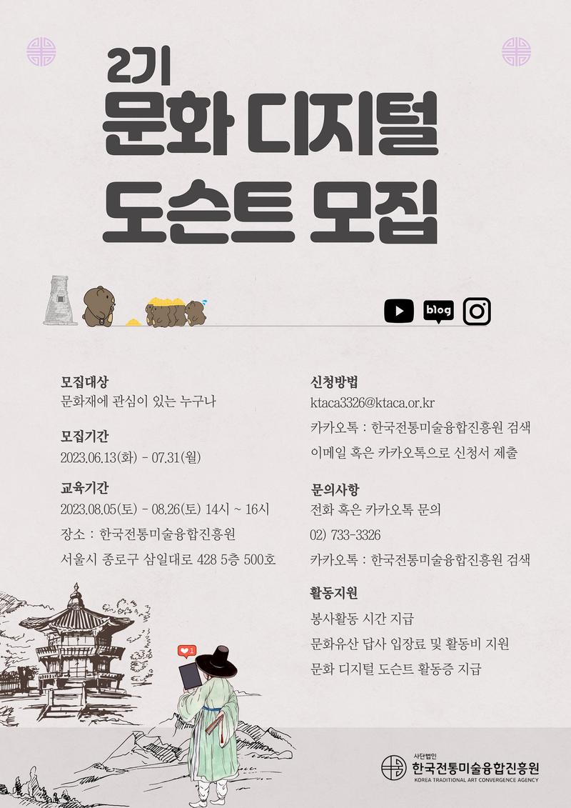 프로그램 : 한국전통미술융합진흥원 문화디지털 도슨트 모집기간 : 2023.06.14\~2023.07.31 모집대상 : 문화유산에 관심이 있는 누구나 활동내용 : 1. 도슨트 교육 수료 2. 우리동네 위치한 문화유산을 직접 답사 3. 우리동네 문화유산을 답사하고 본인만의 표현 방법으로 디지털 콘텐츠를 제작 4. 자신의 SNS에 디지털 콘텐츠 게시 활동지원 : 1. 활동 인증서 및 교육 수료증 발급 2. 봉사활동 시간 제공 3. 활동비 및 답사 지원비