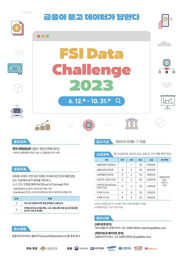 - (대회 운영 문의) 데이터챌린지 운영사무국(02-3495-9934, mainthread@fsec.or.kr)