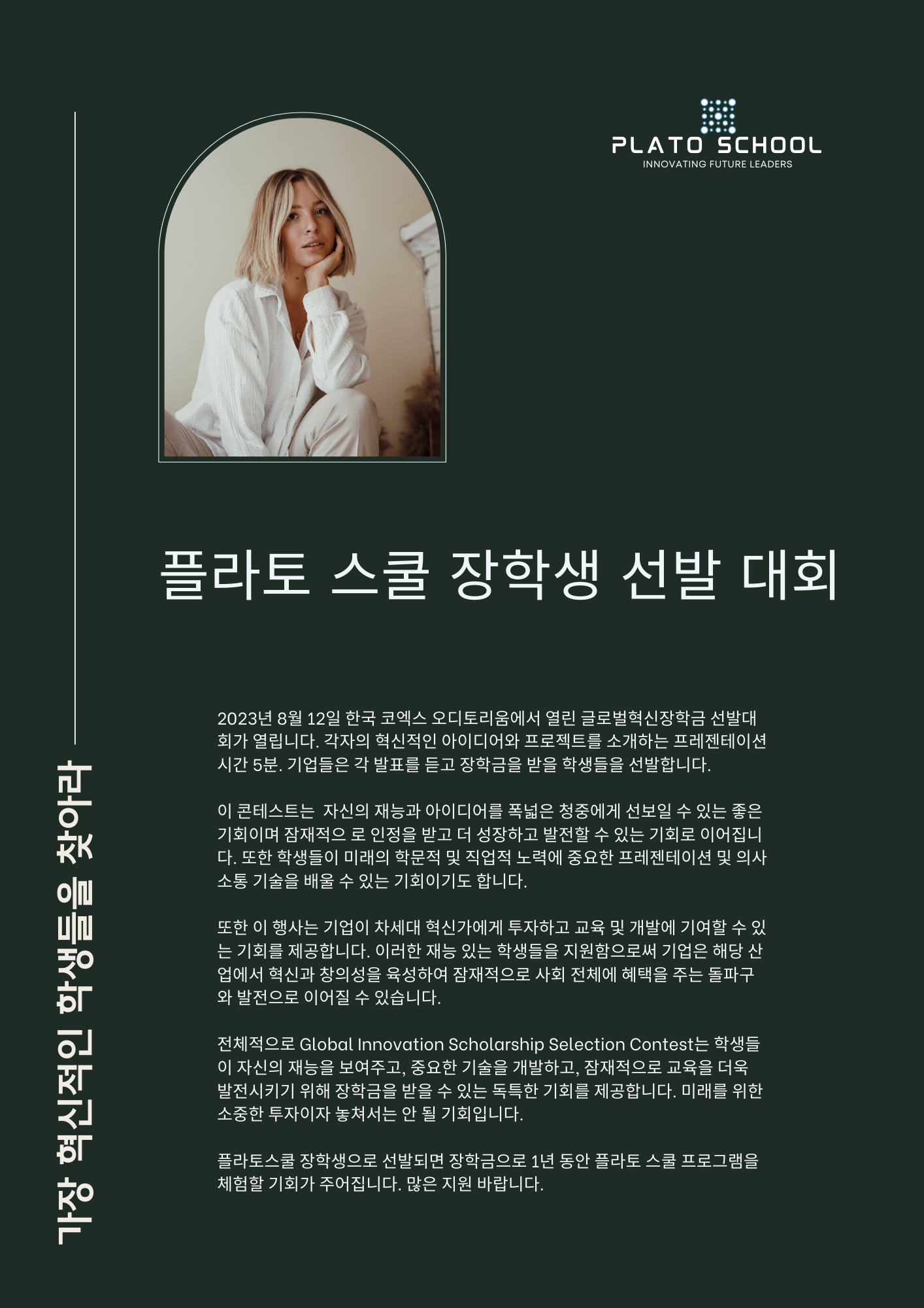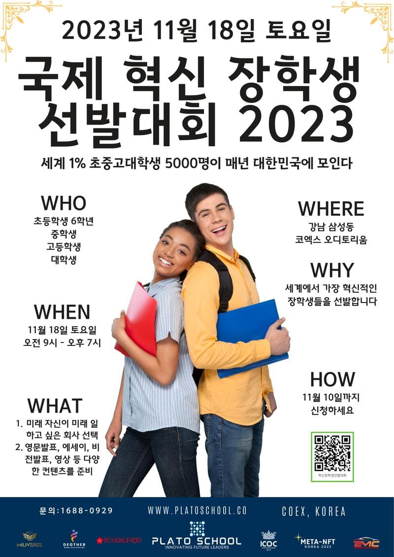 2023년11월 18일 토요일 서울 코엑스 오디토리움에서 세계적인 기업들이 세계에서 가장 혁신적인 학생들을 선발해 장학금을 지급하는 행사를 개최합니다. 학교 장학금 선발 과정은 넷플릭스를 통해 방영될수 있도록 자체 촬영할 예정입니다. 대상은 초등학교(6학년), 중학교, 고등학교, 대학교 각 단계에서 25명을 선발해 총 100명의 장학생을 선발하는 것입니다. 선발 과정은 오전 9시부터 오후 7시까지 진행되며, 학생들은 각 5분 발표를 진행합니다.