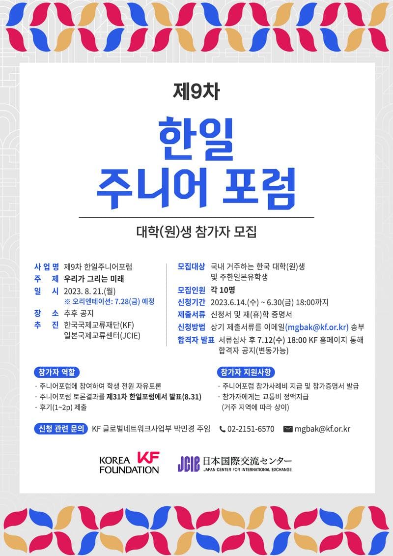1. 사업개요 가. 사업명: 제9차 한일주니어포럼 나. 일시/장소: 2023. 8. 21.(월) 13:00 - 18:00 / 추후 공지 ※ 오리엔테이션: 7.28(금) 예정 다. 추진: 한국국제교류재단(KF), 일본국제교류센터(JCIE) 라. 주제: 우리가 그리는 미래 마. 참가자: 한일 양측 대학(원)생 각 10명 바. 공식 언어: 한국어 2. 공모 개요 가. 모집대상 및 인원: 국내 거주하는 한국 대학(원)생(재학생 및 휴학생) 10명 및 주한일본유학생 10명 나. 공모절차 1) 신청기간: 2023.6.14.(수) - 6.30.(금) 18:00까지 2) 제출서류: 신청서 및 재(휴)학 증명서 3) 신청방법: 상기 제출서류를 이메일(mgbak@kf.or.kr) 송부 ※ 방문, 우편 접수 불가 4) 합격자 발표: 서류심사 후 7.12(수) 18:00 KF 홈페이지를 통해 합격자 공지 (변동 가능) 다. 참가자 역할 1) 주니어포럼에 참여하여 학생 전원 자유토론 2) 주니어포럼 토론결과를 제31차 한일포럼에서 발표(8.31) 3) 후기(1\~2p) 제출 라. 참가자 지원사항 1) 주니어포럼 참가사례비 지급 및 참가증명서 발급 2) 참가자에게는 교통비 정액지급(거주 지역에 따라 상이) 마. 신청 관련 문의: KF 글로벌네트워크사업부 박민경 주임 (02-2151-6570/mgbak@kf.or.kr)