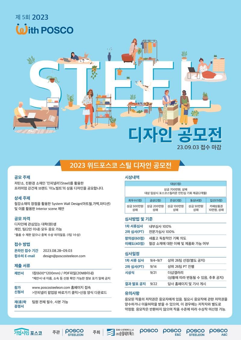 ● 공모주제 저탄소, 친환경 소재인 '인피넬리'(steel)를 활용한 프리미엄 강건재 브랜드 '이노빌트'의 상품 디자인을 공모합니다. ● 상세주제 철강소재의 장점을 활용한 System Wall Design(아트월, 가벽, 파티션) 및 이를 활용한 Interior scene 제안 ● 응모자격 디자인에 관심있는 대학(원)생 개인, 팀(2인 이내) 모두 응모 가능 *출품 수 제한 없으나 중복 수상 하지않음.(1인1팀수상) ● 접수방법 온라인 접수 기간: 2023.08.28\~09.03 접수처: E-mail design@poscosteeleon.com ● 제출서류 1) 제안서 1장(600*1200mm) / PDF파일(20MB 이내) *제안서 내 이름, 소속 등 신원 확인 가능한 정보 표기 일체 금지 2) 참가신청서 www.poscosteeleon.com 홈페이지 접속 > 인피넬리 팝업창 바로가기 클릭 > 신청 양식 다운로드 3) 재(휴)학 증명서 팀원 전체 필수, 사본 가능 ● 시상내역 대상(1점) 상금 700만원, 상패 최우수(1점) 상금 500만원, 상패 금상(2점) 상금 200만원, 상패 은상 (3점) 상금 100만원, 상패 동상(4점) 상금 50만원, 상패 입선(15점) 카페상품권 10만원, 상패 *대상 입상 시 포스코스틸리온 인턴십 기회 제공(2개월) ● 문의 design@poscosteeleon.com