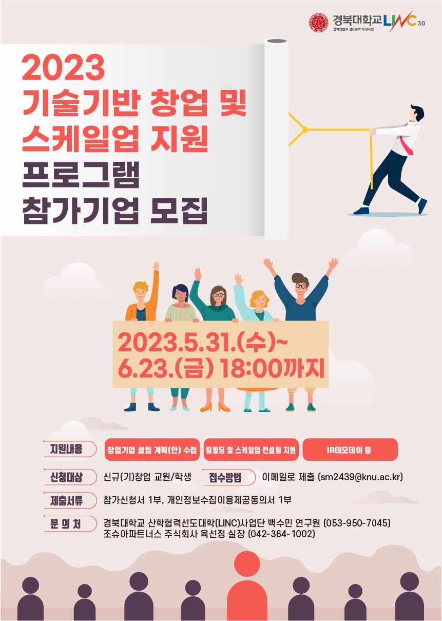 ■ 간단소개 2023년 기술기반 창업 스케일업 지원 프로그램 교원창업, 창업기업 및 예비창업자 모집 ■ 신청방법 이메일 제출 (sm2439@knu.ac.kr) ■ 지원내용 및 대상 ▢ 기획형 창업 액셀러레이팅 프로그램 운영 - 교원창업 이슈 파악 및 프로그램 참여를 위한 자체 설명회 개최 - 선발팀 대상 아이디어 구체화 및 사업계획 수립을 위한 교육· 멘토링 진행 - IR 데모데이 참여 ▢ 집중형 창업 아이템 고도화 프로그램 운영 - 기업(아이템) 진단 및 선발팀 선정 - 진단 결과에 맞는 분야의 집중 컨설팅 실시 - 투자유치 전략 또는 자금확보 컨설팅 ▢ 학생창업 아이템 고도화 프로그램 운영 - 우수창업자 모집 후 선발된 팀 대상 사업계획 수립을 위한 교육 및 멘토링 진행 - IR 데모데이 참여 ■ 문의처 ▢ 조슈아파트너스(주) 육선정 실장 (☏ 042-364-1002, sun@jptnr.com) ▢ 경북대학교 산학협력선도대학(LINC)사업단 백수민 연구원 (☏ 053-950-7045, sm2439@knu.ac.kr) ▢ 경북대학교 산학협력선도대학(LINC)사업단/경북대학교기술지주(주) 김현미 팀장 (☏ 053-950-2381, hmkim7062@knu.ac.kr)