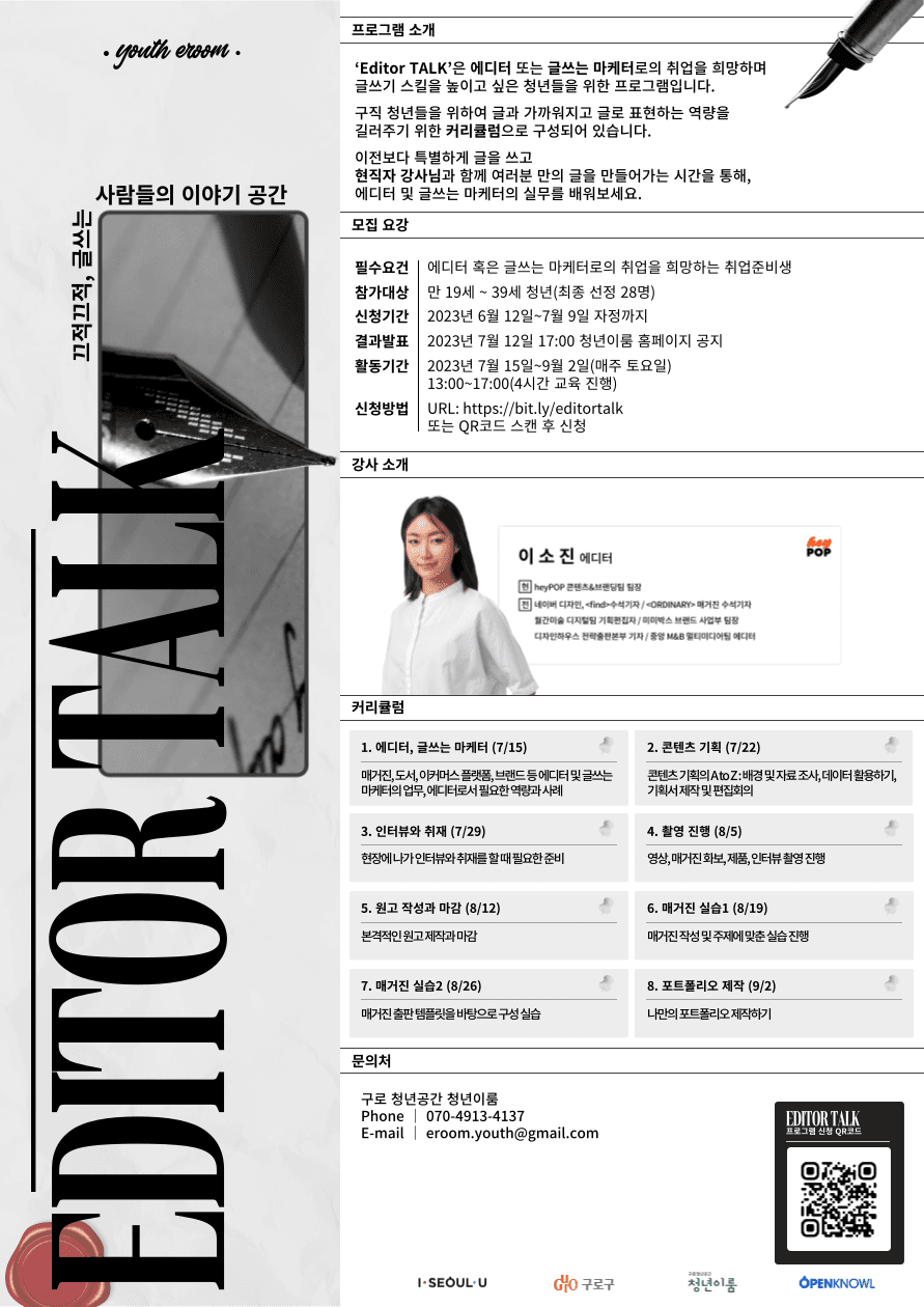 [구로 청년이룸]글쓰는 사람들의 이야기 공간, 에디터톡(\~7/9)