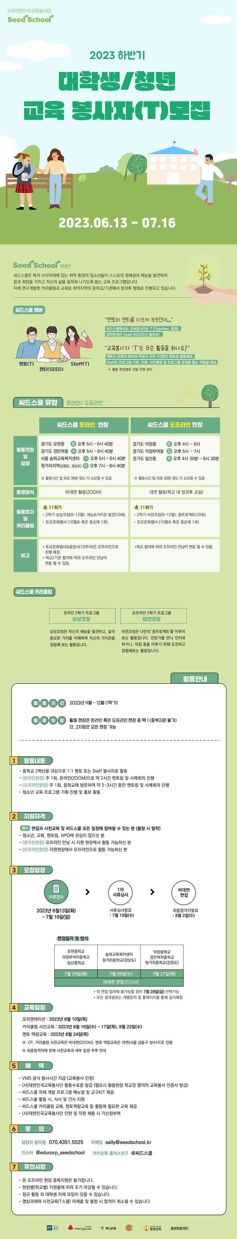 ▶주최사 / 활동명 사단법인 대한민국교육봉사단 / 2023년 하반기 씨드스쿨 교육봉사자(T) 모집 ▶활동내용 - 중학교 2학년을 대상으로 1:1 멘토 또는 Staff 봉사자로 활동 - 청소년 교육 프로그램 기획\,진행 및 홍보 활동 - 온라인현장) 주 1회\, zoom으로 약 2시간 멘토링 및 사례회의 진행 - 오프라인현장) 주 1회\, 해당 중학교에 방문하여 2-3시간 동안 멘토링 및 사례회의 진행 ▶지원자격 (필수) 면접과 사전교육 및 씨드스쿨 모든 일정에 참여할 수 있는 분 (불참 시 탈락) - 청소년\, 교육\, 멘토링\, NPO에 관심이 많으신 분 - 온라인현장) 오프라인 만남 시\, 지원 현장에서 활동 가능하신 분 - 오프라인현장) 지원 현장에서 오프라인으로 활동 가능하신 분 ▶모집기간 2023.6.13(화) \~ 07.16(일) ▶모집 일정 -1차 서류 합격자 발표: 2023년 7월 19일(수) -최종 합격자 발표: 2023년 8월 2일(수) ▶활동기간 2023년 9월 \~ 12월(1학기) ▶교육 일정 (필수) - 오리엔테이션 : 2023년 8월 10일(목) - 커리큘럼교육 : 2023년 8월 16일(수) - 17일(목)\, 23일(수) - 멘토역량교육 : 2023년 8월 24일(목) ※ OT, 커리큘럼 사전교육은 비대면(ZOOM), 멘토역량교육은 대면(서울 성동구 성수)으로 진행 ※ 최종합격자에 한해 사전교육과 세주 일정 추후 안내 ▶활동 혜택 - VMS 공식 봉사시간 지급(교육봉사인정) - (사) 대한민국교육봉사단 활동수료증 발급 (필요시 활동현장 학교장 명의의 교육봉사 인증서 발급) - 씨드스쿨 자체 개발 프로그램 메뉴얼 및 교구 KIT 제공 - 씨드스쿨 활동 시\, 식사 및 간식 지원 - 씨드스쿨 커리큘럼 교육\, 멘토역량교육 등 활동에 필요한 교육 제공 - (사) 대한민국교육봉사단 인턴 및 직원 채용 시 가산점부여 ▶문의 카카오톡: @씨드스쿨 인스타그램:@educorp_seedschool 담당자: 함미정 간사 (070-4351-5525 / sally@seedschool.kr) ★아래 페이지를 통해 신청해 주세요!★ https://zrr.kr/G7ou