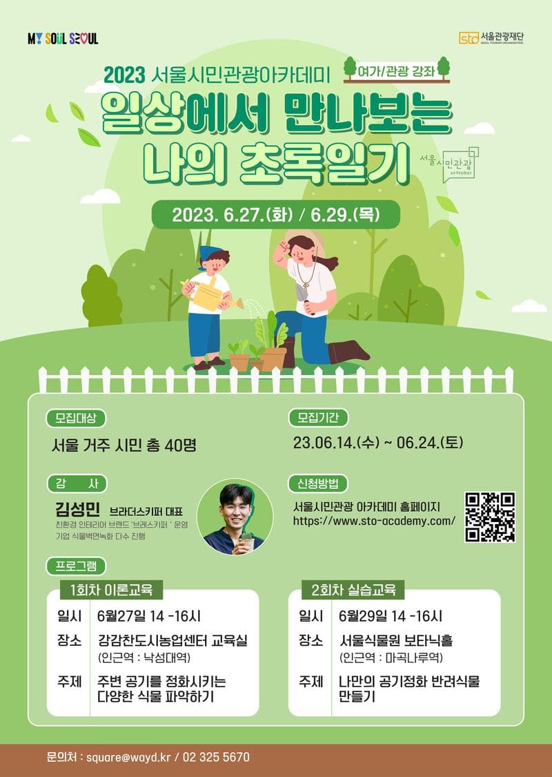 [일상에서 만나보는 나의 초록일기] ✅모집기간 : 23.6.14.(수)\~6.24.(토) ✅모집대상 : 서울 거주 시민 40명 ✅특강일정 : 23.6.27.(화)/6.29.(목) 14:00 \~16:00 ✅교육장소 : 1. 강감찬 도시농업센터 2. 서울식물원