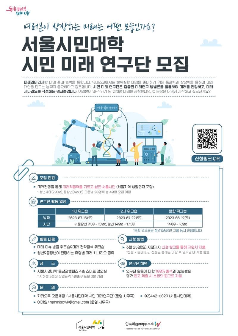 여러분이 상상하는 미래는 어떤 모습일지 지금 미래연구단이 되어 미래를 전망해 보고 관련 시나리오까지 작성해 보는 워크숍에 참여하세요! ● 이런 분께 추천합니다 미래전망을 통해 미래적응력을 기르고 싶은 서울시민 ※서울지역 생활권자 포함 ● 프로그램 내용 · 미래 연구방법론 학습을 통한 미래 이슈 발굴 · 20년 후 미래 시나리오 구축과 미래상 구체화, 미래 전략탐색 · 미래학 박사 초청, 청년&중장년이 전망하는 유형별 미래 시나리오 도출 ● 프로그램 일정 · 1차 워크숍: 7.15 (토) / (중장년: 9:30\~13:00, 청년: 14:00\~17:30) · 2차 워크숍: 7.22 (토) / (중장년: 9:30\~13:00, 청년: 14:00\~17:30) · 종합 워크숍: 2023년 8월 19일 (토) / (14:00\~16:00) ● 프로그램 장소 · 서울시민대학 동남권캠퍼스 4층 스마트강의실 외 ● 참여 혜택 · 100%참석 및 시나리오 작성 시, 소정의 원고비 지급 ● 모집 인원 · 청년(2030) 20명, 중장년(4060) 20명, 총 40명 모집 ※ 세대별로 그룹을 나누어 진행 ● 신청 안내 · 신청기간: 6월 14일 (수) \~ 6월 25일 (일) ※ 마감 후 일주일 내 합격자에 한하여 개별 통보 · 신청방법: 포스터 QR코드 스캔 혹은 하단의 구글폼 링크로 접속하여 양식 작성 신청링크: https://url.kr/hvpcli