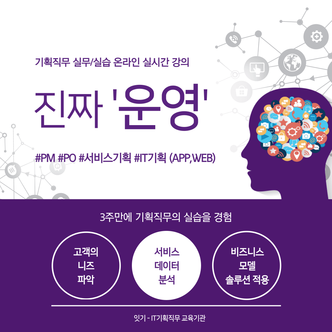 안녕하세요, 현재 IT PM/PO직 및 기획교육을 진행하고 있는 잇기입니다. 여러분들께 "온라인으로 진행하는 [진짜 운영] 강의"를 소개합니다! 실제 기획 실무자들이 매일 하는 업무는 어떤것이 있을까요? 0에서 1을 만들고 나서의 그 다음 이야기 진짜 운영을 알려드립니다. ●모집기간 : 2023.06.27까지 ● <진짜 운영>만의 특징!! 1) 실시간 온라인 강의로 진행되어 지역에 상관없이 가능합니다. 2) 각자 서비스 한개를 선정하여 프로젝트를 진행해봅니다. 3) 실습 중심의 커리큘럼 구성으로 진행됩니다. 4) 연봉 상위 1%의 꿀팁과 연봉상승의 노하우를 배웁니다. ●진짜 운영에서는 무엇을 배우는가? (3주 과정) 1) 앱 서비스 1개를 선정하여 역기획을 진행합니다. 2) 앱 서비스의 개선안을 BM과 연결시켜 업데이트를 하는 애자일 과정을 진행합니다. 3) 해당 앱 서비스를 실제 고객에게 평가를 받습니다. 4) 운영의 과정을 정리한 포폴을 제작합니다. ●잇기 강의만의 혜택 1) 실무강의 진행 2) 개인 포트폴리오 작성 3) 수료증 증정 4) 각종 잇기 프로그램에 할인혜택 5) 기획직무에 희망하거나 현직자들과의 소통방 형성 (소셜링) ●멘토소개 멘토 : 송사장 - IT업계 13년차 - 창업 3회(6년) - 기획파트 리더직책 - 다수의 프로젝트 진행경험 - IT회사 기획직군\, 사업전략 포지션 ●커리큘럼 및 상세안내 : https://forms.gle/k9YefY3LrQmSb4ut5 ●문의 1) 잇기 홈페이지 : https://url.kr/89i7wx 2) 카톡 : https://open.kakao.com/me/Creatorsong