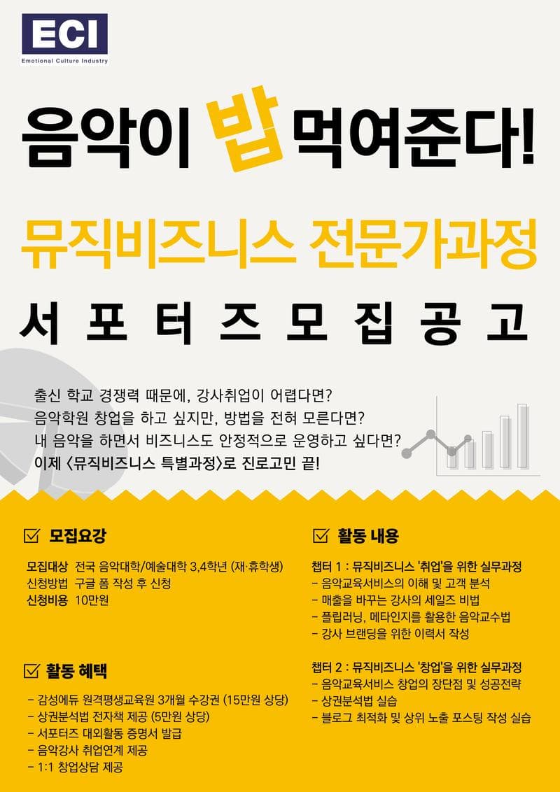 ○ 활동내용 * 챕터 1 : 뮤직비즈니스 '취업'을 위한 실무과정 음악교육서비스의 이해 및 고객 분석 매출을 바꾸는 강사의 세일즈 비법 플립러닝, 메타인지를 활용한 음악교수법 실습 강사 브랜딩을 위한 이력서 작성 실습 * 챕터 2 : 뮤직비즈니스 '창업'을 위한 실무과정 음악교육서비스 창업의 장단점 및 성공전략 상권분석법 실습 블로그 최적화 및 상위 노출 포스팅 작성 실습