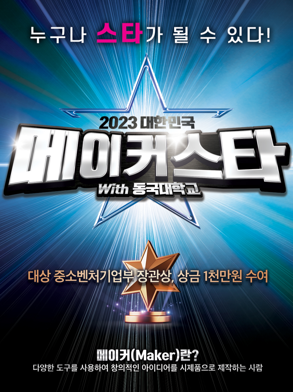 □ **(대 회 명)** **2023 대한민국 메이커 스타** □ **(대회목적)** 혁신적인 아이디어를 실제 시제품으로 구현하는 메이커 경진대회를 통해 유망 제조창업자 발굴 및 제조 창업촉진 □ **(참가대상)** 메이커에 관심있는 **국민 누구나**(3명 이하 팀지원 가능) □ **(공모내용)** **자유주제**(혁신적인 제품 아이디어) - 1팀당 1개의 아이디어만 제출 가능(중복 신청 불가) □ **(운영절차)** 선정평가(서류) → 밋업데이 → 시제품제작 → 컨설팅지원 → 최종평가(발표) □ **(지원규모)** 30팀 내외 □ **(시상규모)** 상장 30점, 상금 총 24백만원 □ **(지원기간)** 선정일로부터 약 3개월(’23. 7월 중순 \~ ’23.10월 초) □ **(시제품 제작 지원)** 매칭된 참가자-메이커 스페이스가 제작기간 동안 협동하여 아이디어 고도화 및 시제품 제작 ◦ **(제 작 품)** 기능구현이 가능한 ****워킹 목업 수준의 시제품 ◦ **(지원범위)** 메이커 스페이스 담당자와 협의 하에 제작에 수반되는 장비, 재료, 컨설팅 등을 포함한 전반적 제작 지원 □ **(디자인·제조컨설팅)** 시제품 제작 과정에서 아이디어 개선 및 우수 시제품 제조 연계를 위해 메이커 담당자 또는 전문가 컨설팅 추진 ◦ **(디자인 컨설팅)** 참가자 시제품 제작 구현 및 경쟁력 강화를 위한 디자인·기능 개선 및 개발 방향 조정 등 ◦ **(제조 컨설팅)** 참가자 창업 역량 성장 지원을 위한 시제품 제조공장 매칭 지원 및 양산 연계 등 □ **시상** ◦ **(시상)** 최종 평가 결과에 따라 상장 및 상위 10팀에 대한 상금 수여 - 상위 10팀의 경우 별도의 시제품 전시 및 시상식이 진행될 예정이며\, 시상식 참석 및 시제품 전시에 적극 협조하여야 함 □ **(신청기간)** 2023년 5월 30일(화) \~ 6월 29일(목), 17:00까지 □ **(신청방법)** ‘**K-스타트업 누리집**(www.k-startup.go.kr)’을 통해 온라인 신청 - 주관기관 : 동국대학교 신청!