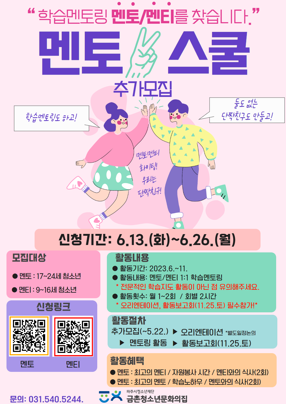 안녕하세요? 금촌청소년문화의집입니다. 1:1 학습지도멘토링, '멘토스쿨'에 함께 할 멘토와 멘티를 모집합니다!! 멘토와 멘티가 이야기도 나누고, 식사도 하며 둘도 없는 단짝이 되고! 멘티가 그동안 고민이었던 공부과목에서 멘토에게 학습 노하우를 전달받고! 혹시 멘토스쿨로 함께 하고 싶은 멘토와 멘티는 자유롭게 신청해주세요! 신청방법은 아래 포스터에 QR코드 스캔 혹은 아래 링크를 접속해주시면 됩니다! 멘토: https://forms.gle/RK9vJ4LmzvxFDau26 멘티: https://forms.gle/t3ks7ZeBahzs9wgs9 관련하여 궁금하신 사항 있으시면 말씀해주세요. 감사합니다.