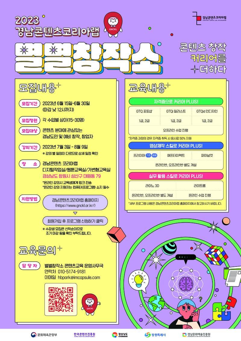 ○ 모집개요 - 경남 지역 도민의 문화 콘텐츠 창·제작 관심 유도 및 콘텐츠 산업에 대한 인식 폭 확대를 위한 콘텐츠 교육을 운영하오니 관심이 있는 분들의 많은 참여 바랍니다. ○ 기간 및 일정 - 모집기간: 2023.6.15.(목)\~6.30(금) - 수업일정: 2023.7.3.(월)\~8.9(수) (반별 일정 상이) *강의 별 일정이 다르므로 상세 일정 확인 ○ 지원자격 - 콘텐츠 분야에 관심있는 경남도민 및 예비 창작, 창업자 ○ 모집인원 - 각 수업별 상이 ○ 주소 : 경상남도 창원시 성산구 대원동 79 *온라인 강의시 교육생에게 링크 전송 *온라인 강의 지원자는 컴퓨터 소지 필수 ○ 접수방법 - 경남콘텐츠코리아랩 홈페이지 프로그램 신청하기 *수강생 모집은 선착순이므로 조기 마감 됨을 확인 부탁드립니다. ○ 혜택내역 - 전 과정 무료 교육 ○ 문의 - ☏ 010-5174-9181 / hbpark@imcapsule.com