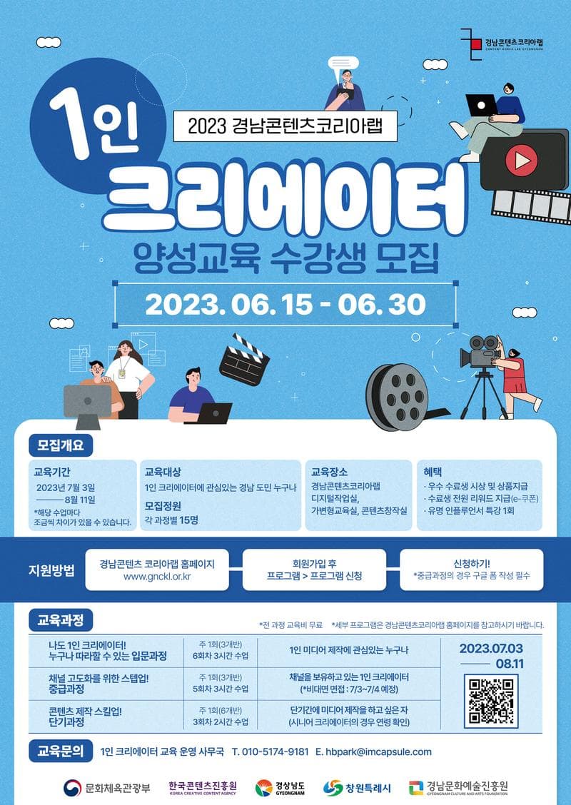 ○ 모집개요 - 경남 지역 도민의 1인 크리에이터 교육 등을 통한 채널 기획 · 콘텐츠 제작 능력 제고 및 로컬 크리에이터 양성을 위한 콘텐츠 교육을 운영하오니 관심이 있는 분들의 많은 참여 바랍니다. ○ 기간 및 일정 - 모집기간: 2023.6.15.(목)\~6.30(금) - 수업일정: 2023.7.3.(월)\~8.29(화) (반별 일정 상이) *강의 별 일정이 다르므로 상세 일정 확인 ○ 지원자격 - 1인 크리에이터에 관심있는 경남도민 누구나 - 중급과정 : 채널을 보유하고 있는 1인 크리에이터(비대면 면접 : 7/3\~7/4 예정) ○ 모집인원 - 각 수업별 상이 ○ 주소 : 경상남도 창원시 성산구 대원동 79 ○ 접수방법 - 경남콘텐츠코리아랩 홈페이지 프로그램 신청하기 *수강생 모집은 선착순이므로 조기 마감 됨을 확인 부탁드립니다. ○ 혜택내역 - 전 과정 무료 교육 우수 수료생 시상 및 상품지급 수료생 전원 리워드 지급(e-쿠폰) 유명 인플루언서 특강 1회 ○ 문의 - ☏ 010-5174-9181 / hbpark@imcapsule.com