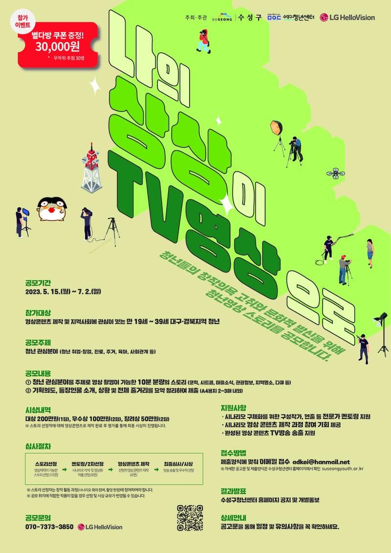 "나의 상상이 TV영상으로" 공모전 "청년들의 창작의욕 고취와 문화 발산을 위해 청년 영상 스토리를 공모합니다!" ■ 공모기간 : 2023. 05. 15.(월) \~ 06. 09.(금) ■ 참가대상 : 영상콘텐츠 제작 및 지역사회에 관심 있는 대구·경북 청년(만19\~39) 개인 또는 팀 ※ 영상제작 구성 회의 및 촬영 현장 오프라인 참석이 가능한 청년 ■ 공모주제 : 청년 관심분야 (청년 취·창업, 진로, 주거, 육아, 사회관계 등) ■ 공모내용 1) 청년 관심분야를 주제로 영상 촬영이 가능한 10분 분량의 스토리 2) 기획의도, 등장인물 소개, 상황 및 줄거리 요약 정리하여 제출(A4용지 2\~3매 내외) ■ 제출서 : 신청서류 1부 ※ 수성구청년센터 홈페이지 신청 서식 다운로드(www.suseongyouth.or.kr) ■ 시상규모 : 시상금 총 500만원 - 대상 200만원(1팀), 우수상 100만원(2팀), 장려상 50만원(2팀) ※ 스토리 선정작에 대해 영상콘텐츠로 제작 완료 후 평가를 통해 최종 시상이 진행됩니다. ■ 지원사항(스토리 선정작 대상) 1) 시나리오 구체화를 위한 구성작가, 연출 등 전문가 멘토링 지원 2) 시나리오 영상 콘테츠 제작 과정 참여 기회 3) 완성된 영상콘텐츠 TV방송 송출 지원 ■ 접수방법 : 이메일 접수 (adkei@hanmail.net) ※ 자세한 사항은 공고문 및 제출양식을 확인해 주세요. 수성구청년센터 홈페이지(www.suseongyouth.or.kr) ■ 결과발표 : 수성구청년센터 홈페이지 및 개별통보 ■ 공모문의 : 070-7373-3850 (주)엘지헬로비전 대구수성방송 ■ 상세안내 : 공고문을 통해 일정 및 유의사항을 확인해주세요. ■ 주최/주관: 대구광역시 수성구 · 수성구청년센터 · (주)엘지헬로비전 대구수성방송