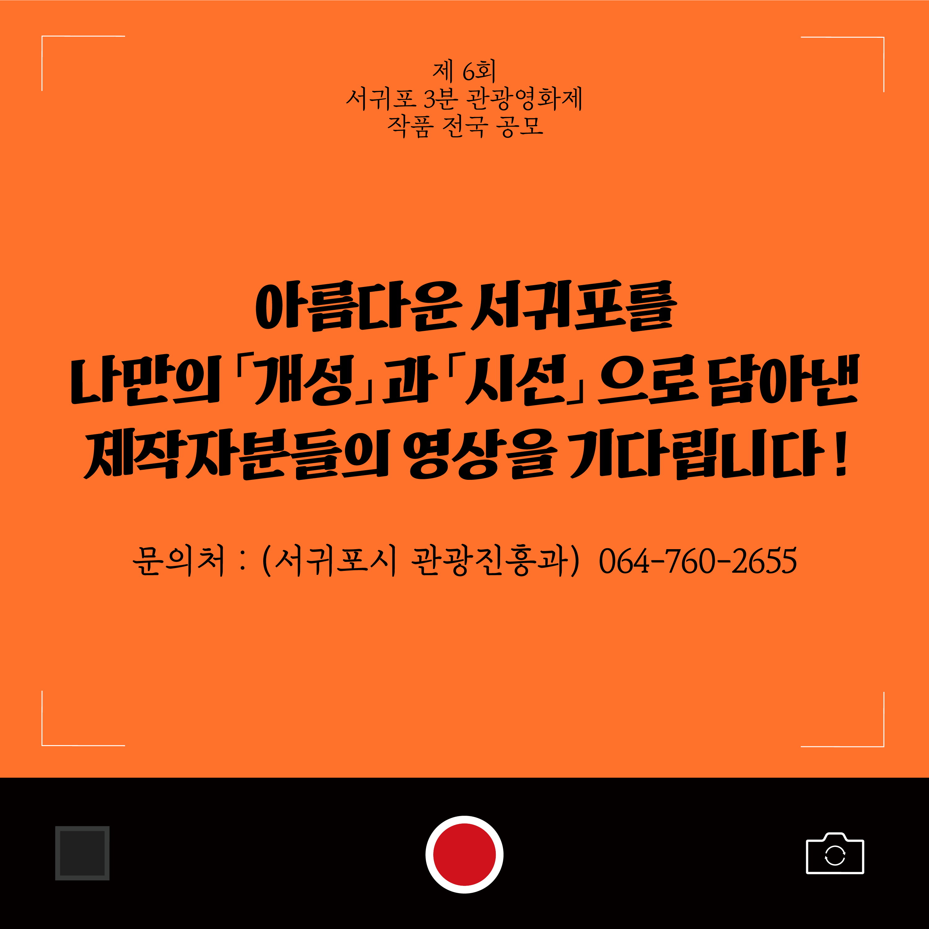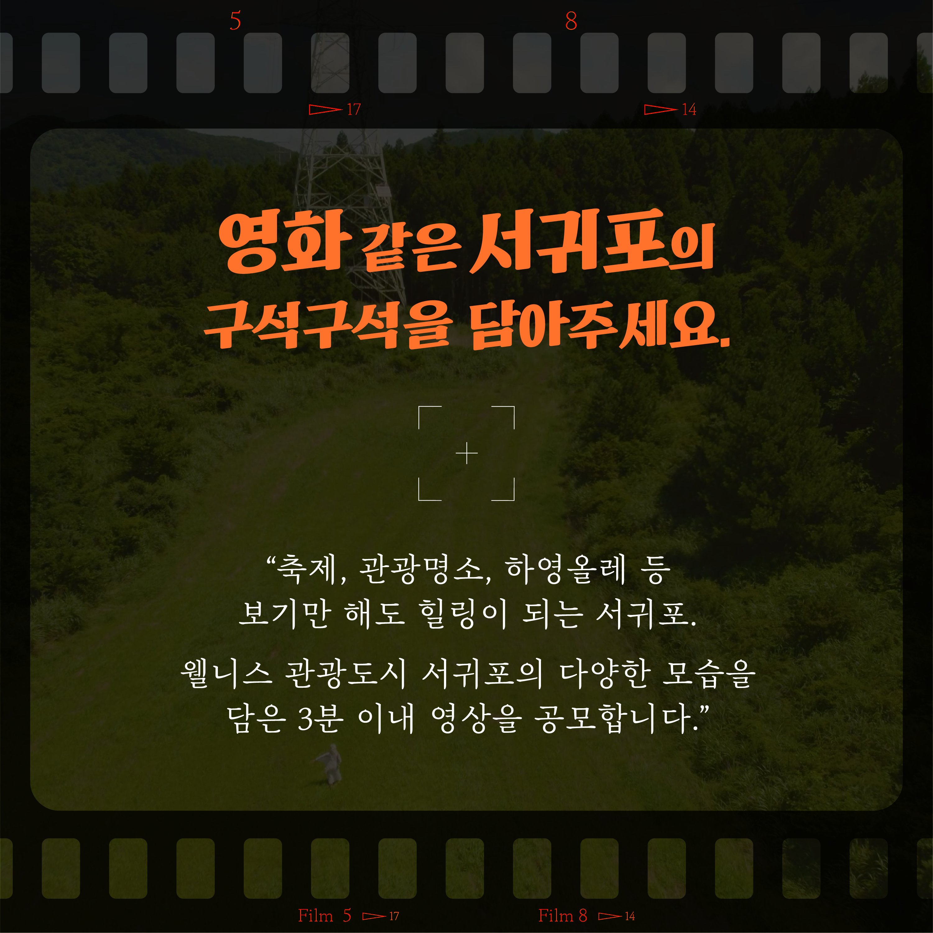 서귀포에는 축제, 관광명소, 하영올레 등 풍성한 볼거리, 즐길거리가 있는데요 웰니스 관광도시 서귀포의 다양한 모습을 담은 3분 이내 영상을 공모합니다.🎥🎞️