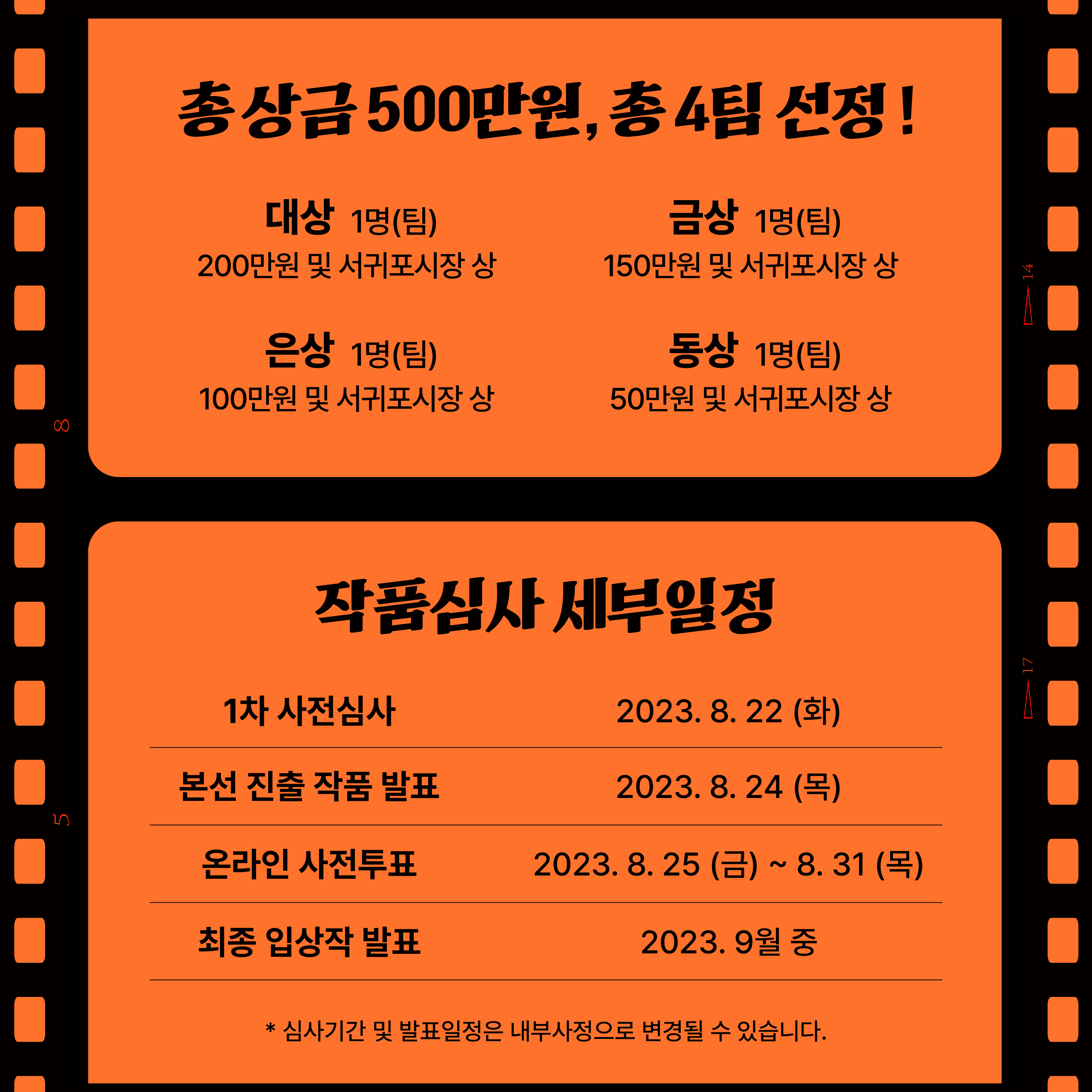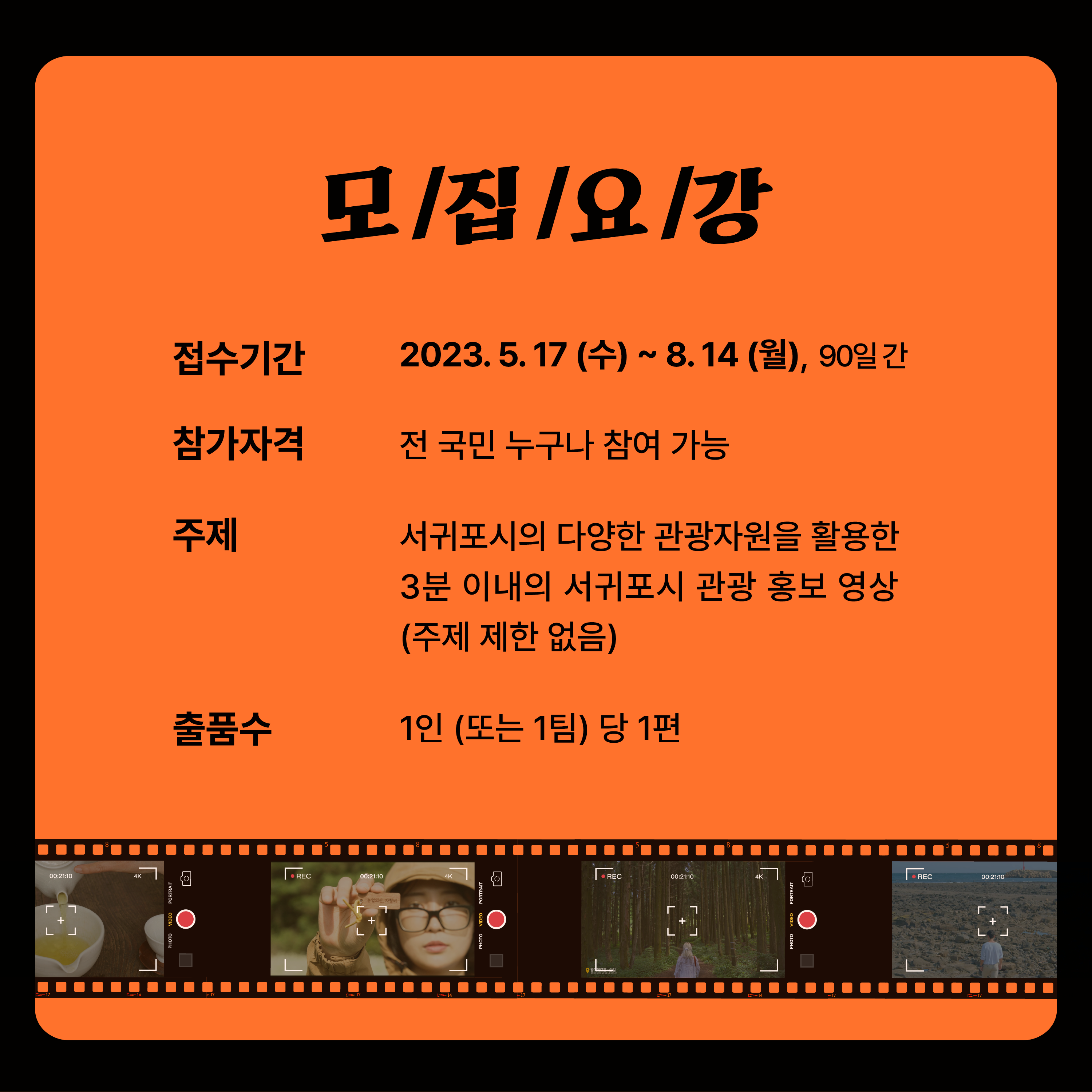 <모집안내> 🔸접수기간 : 2023. 5. 17(수) - 8. 14(월), 90일간 🔸참가자격 : 전 국민 누구나 참여가능 🔸주제 : 서귀포시의 다양한 관광자원을 활용한 '3분 이내의' 서귀포시 관광 홍보영상 (주제 제한 없음) 🔸출품수 : 1인(또는 1팀) 당 1편