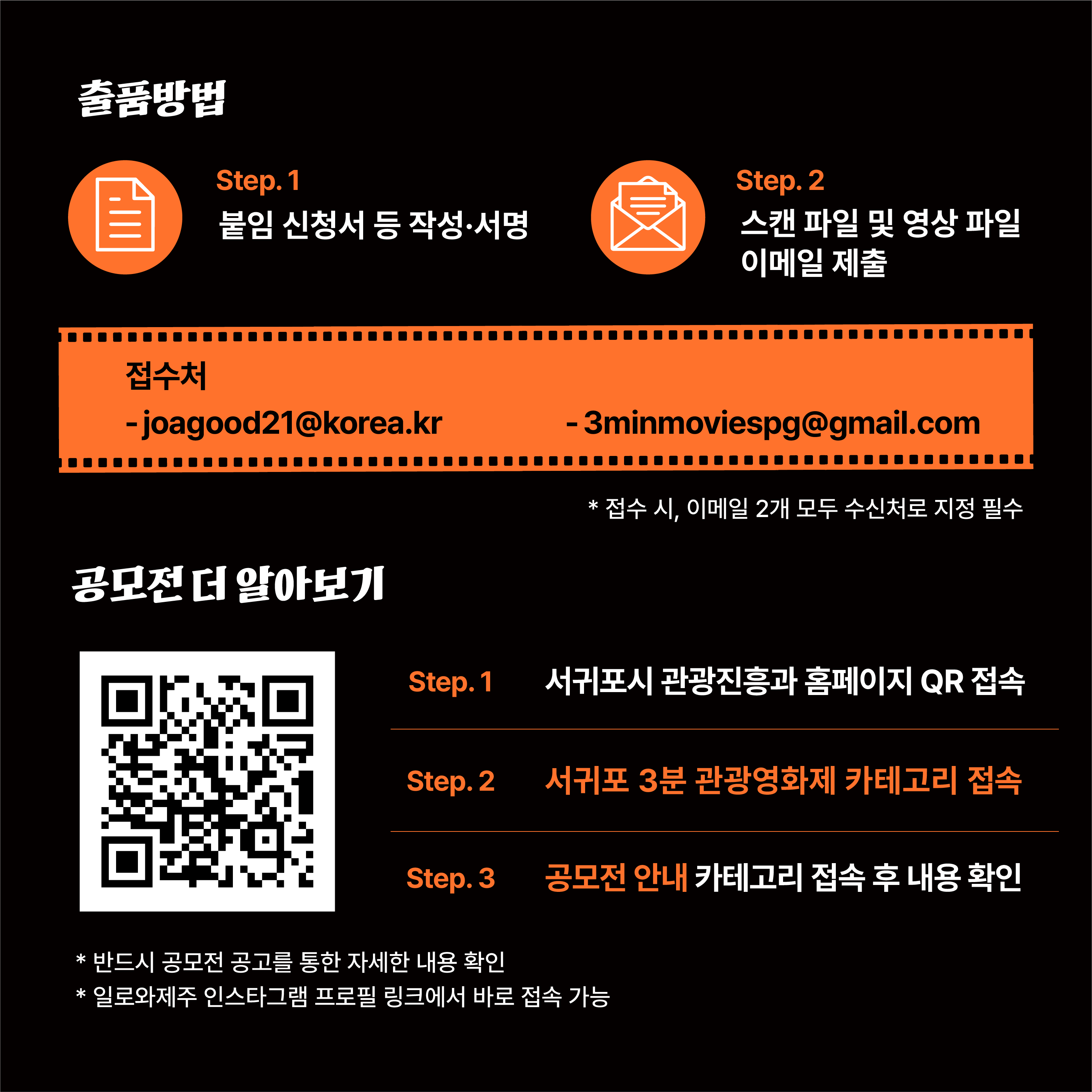 <접수방법> 1. 서귀포시 관광진흥과 홈페이지 접속 2. '서귀포 3분 관광영화제' 카테고리 접속 3. 공모전 신청 서류 등 확인 후 접수