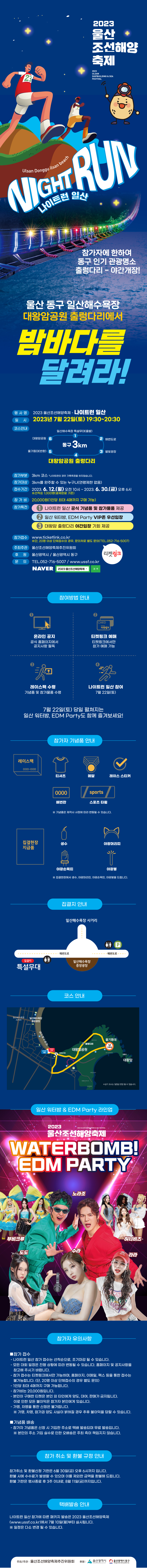 ■공모 주제 -울산 동구 일산해수욕장 대왕암공원 출렁다리에서 밤바다를 달려라! ■참가 자격 -3km를 완주할 수 있는 누구나(연령제한 없음) ■참가비 -20,000원(1인당 최대 4매까지 구매가능) ■접수 기간 -2023 6.12(월) 오전 10시 \~ 2023. 6. 30(금) 오후 6시 *선착순 1,000명(결제완료 기준) ■접수 방법 티켓링크 www.ticketlink.co.kr *단, 20명 이상 단체접수의 경우, 문의처로 별도 문의(TEL. 052-716-5007) ■문의 사항 -자세한 문의는 울산조선해양축제 공식홈페이지 ussf.co.kr -울산조선해양축제추진위원회 TEL(052)716-5007