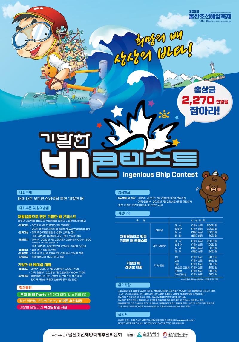 2023 울산조선해양축제 기발한배 콘테스트** ■공모 주제 -배에 대한 무한한 상상력을 통한 ‘기발한 배’ 풍부한 상상력을 바탕으로 재활용품을 활용한 기발한 배 제작대회 ■참가 대상 -대학부 50개팀(팀당2\~5명), 선착순 접수 (*대학부는 1박2일로 진행됩니다.) -가족/일반부 50개팀(팀당2\~5명), 선착순 접수 ■공모 일정 2023년 6월 12일(월)\~7월 10일(월) 접수신청 ■접수 방법: 홈페이지 접수 2023 울산조선해양축제 홈페이지 ussf.co.kr ■시상 내역 -대학부 대 상 (1팀) 상금 500만원 최우수 (1팀) 상금 300만원 우 수 (3팀) 상금 100만원 장 려 (5팀) 상금 50만원 -가족/일반부 대 상 (1팀) 상금 200만원 최우수 (1팀) 상금 100만원 우 수 (3팀) 상금 50만원 장 려 (5팀) 상금 30만원 ■문의 사항 -자세한 문의는 울산조선해양축제 공식홈페이지 www.ussf.co.kr -울산조선해양축제추진위원회 TEL(052)716-5007