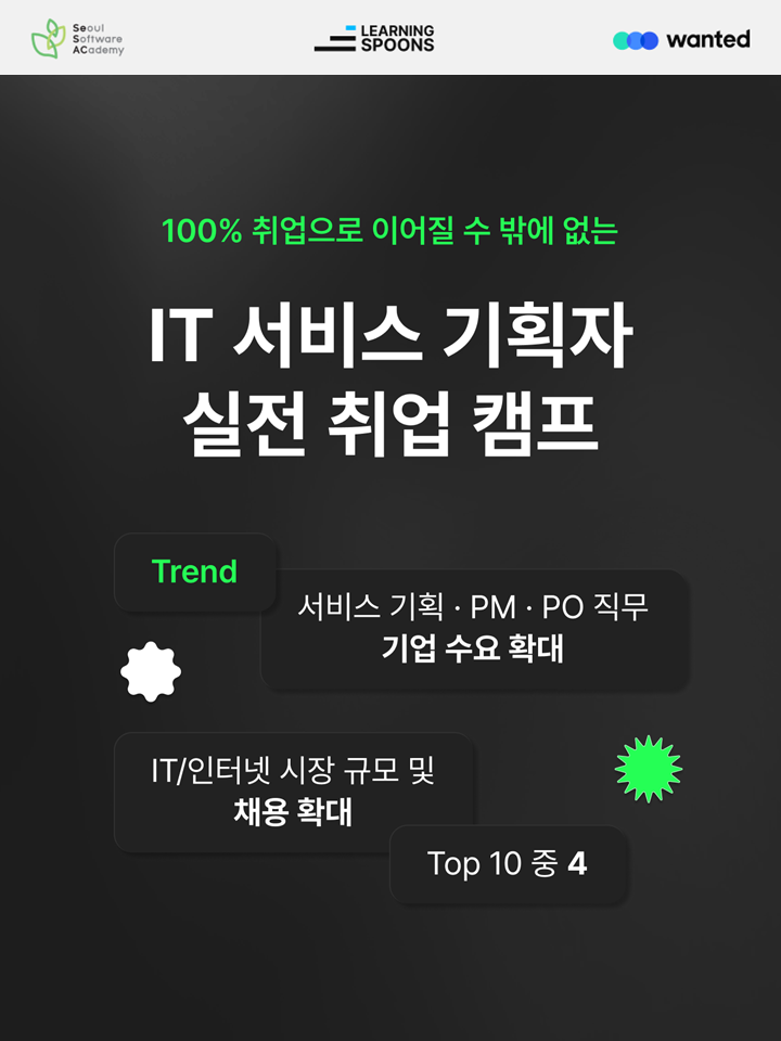 새싹 SeSAC X 러닝스푼즈 IT 서비스 기획자 취업 캠프 모집- 교육비 전액 무료! 진짜 서비스 기획자들의 생생한 업무 경험을 모두 배울 수 있는 기회! - 유니콘 기업부터 대기업까지 다양한 도메인을 경험해 온 현직 실무진과 함께합니다. - 가장 대표적인 사업군 5가지의 역기획 실습 프로젝트를 통해 실무에 바로 투입 가능한 인재로 성장할 수 있습니다. - 원티드 플랫폼을 통한 합격 시 채용 보상금 100만원까지!