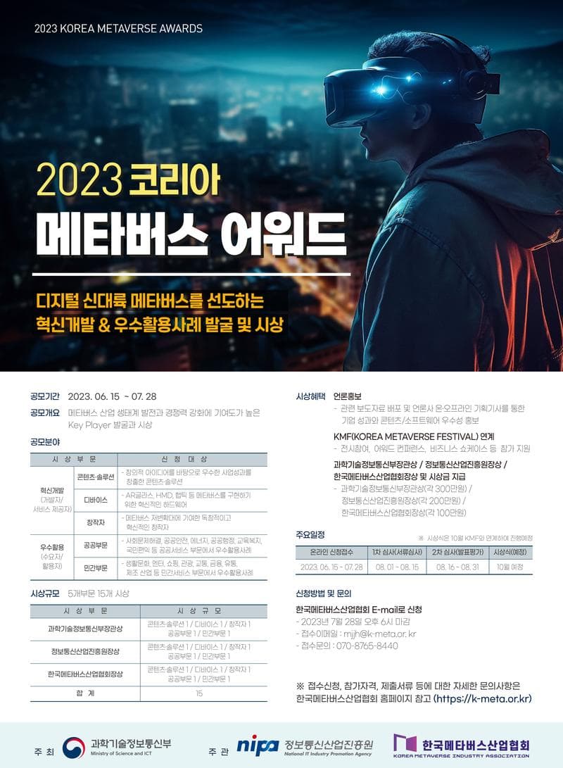 안녕하세요? 한국메타버스산업협회 사무국입니다. 과학기술정보통신부가 주최하고 정보통신산업진흥원, 한국메타버스산업협회가 주관하는 “2023 코리아 메타버스 어워드”를 다음과 같이 공모하여 안내드립니다. 가. 공모 개요 • 공모명: 2023 코리아 메타버스 어워드. • 공모기간: 2023. 6.15(목) \~ 2023.7.28(금) 18:00 • 주최/주관: 과학기술정보통신부/정보통신산업진흥원, 한국메타버스산업협회 • 공모부문: 5개 부문(혁신개발부문_콘텐츠•솔루션/디바이스/창작자, 우수활용사례부문_공공/민간부문) • 시상: 과학기술정보통신부장관상(5개)/정보통신산업진흥원장상(5개)/한국메타버스산업협회장상(5개) 나. 신청 방법 및 문의 • 신청방법: 이메일 접수(mjjh@k-meta.or.kr) • 신청서 작성방법: 첨부한 공고문 內 신청서와 제출서류 작성하여 이메일로 제출. • 문의처: 한국메타버스산업협회 주정현 차장(070-8765-8440)