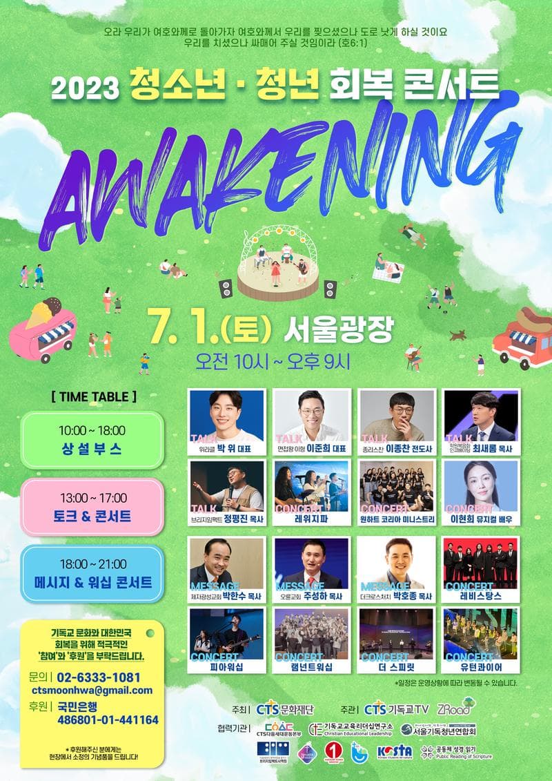 ■ 행 사 명 : 2023 청소년·청년 회복 콘서트 "AWAKENING" ■ 행사일시 : 2023년 7월 1일(토) * 상 설부 스 10:00 - 18:00 * 토크콘서트 13:00 - 17:00 * 워십콘서트 18:00 - 21:00 *운영상황에 따라 변동될 수 있습니다
