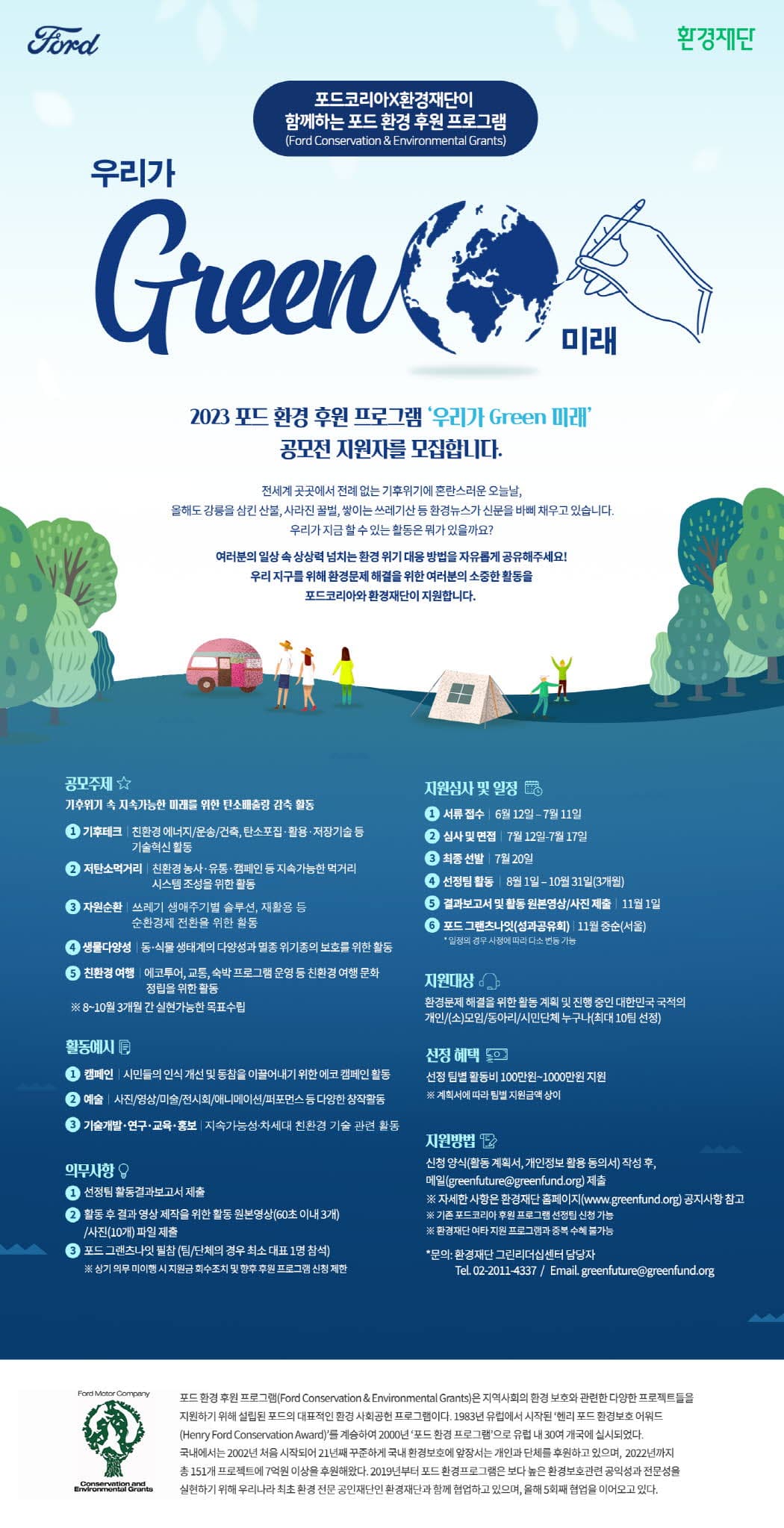 2023 포드 환경 후원 프로그램 '우리가 Green 미래' 활동 공모전 지원자를 모집합니다. 환경문제 해결을 위한 여러분의 소중한 활동을 환경재단과 포드코리아가 지원합니다.