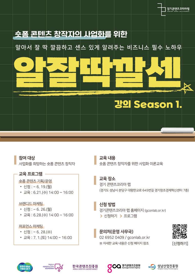 숏폼 창작자를 위한 알잘딱깔센(알아서 딱 깔끔하고 센스있게)강연은 경기 콘텐츠 진흥원과 경기 콘텐츠코리아 랩에서 숏폼 콘텐츠 창작자의 사업화를 위한 비즈니스 노하우를 안내하는 교육입니다.