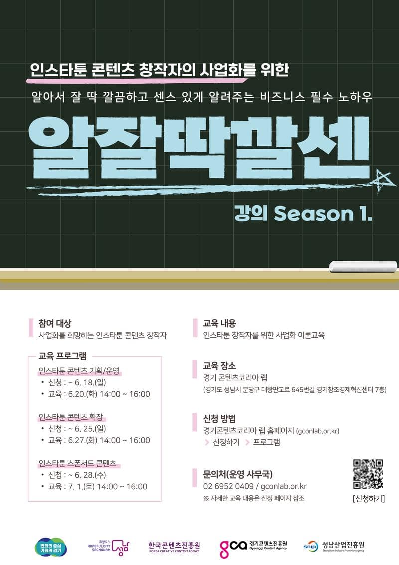 인스타툰 창작자를 위한 알잘딱깔센(알아서 딱 깔끔하고 센스있게)강연은 경기 콘텐츠 진흥원과 경기 콘텐츠코리아 랩에서 인스타툰 콘텐츠 창작자의 사업화를 위한 비즈니스 노하우를 안내하는 교육입니다.