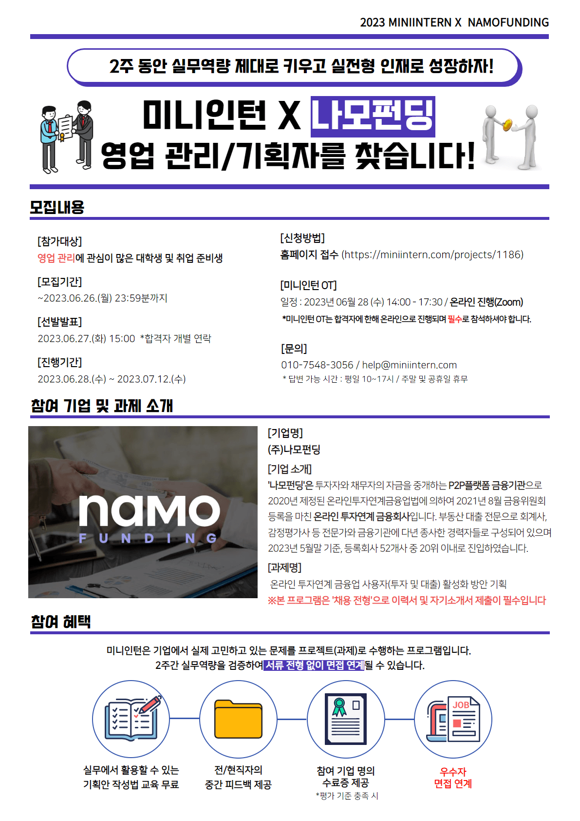 ▷개별 과제 소개 -‘나모펀딩’의 온라인 투자연계 금융업 사용자(투자 및 대출) 활성화 방안 기획** *사전 온라인 OT 이후 2주간 개별 진행 ▷지원 방법 -온라인 신청: https://bit.ly/3CAfZxz *신청 시 필요한 회원 가입은 메일 주소와 비밀번호만 설정하시면 됩니다:) ▷문의처 -전화: 010-7548-3056(평일 10시\~18시/주말 및 공휴일 휴무) -메일: help@miniintern.com