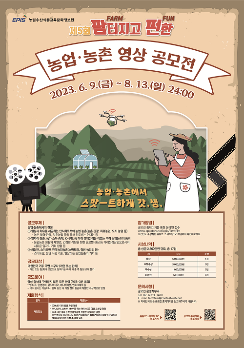 ❍ 응모 방법 - 공모전 홈페이지를 통한 온라인 제출(http://www.spectory.net/epis/farmfilm) ※전년도 수상작과 농업 농촌의 다양한 콘텐츠는 유튜브 ‘스마트팜 TV’채널에서 확인하세요. ❍ 접수 기간 - 2023. 6. 9.(금) \~ 2023. 8. 13.(일) 24:00까지 (66일간) ❍ 시상내역 - 총 17점, 총 상금 2,300만원 (농림수산식품교육문화정보원장상)