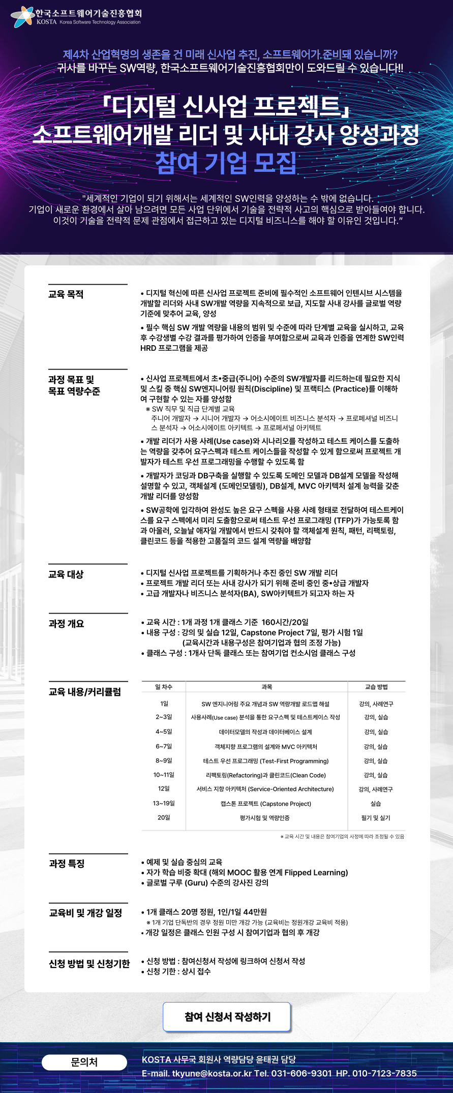 ◼️교육 대상 • 디지털 신사업 프로젝트를 기획하거나 추진 중인 SW 개발 리더 • 프로젝트 개발 리더 또는 사내 강사가 되기 위해 준비 중인 중•상급 개발자 • 고급 개발자나 비즈니스 분석자(BA), SW아키텍트가 되고자 하는 자
