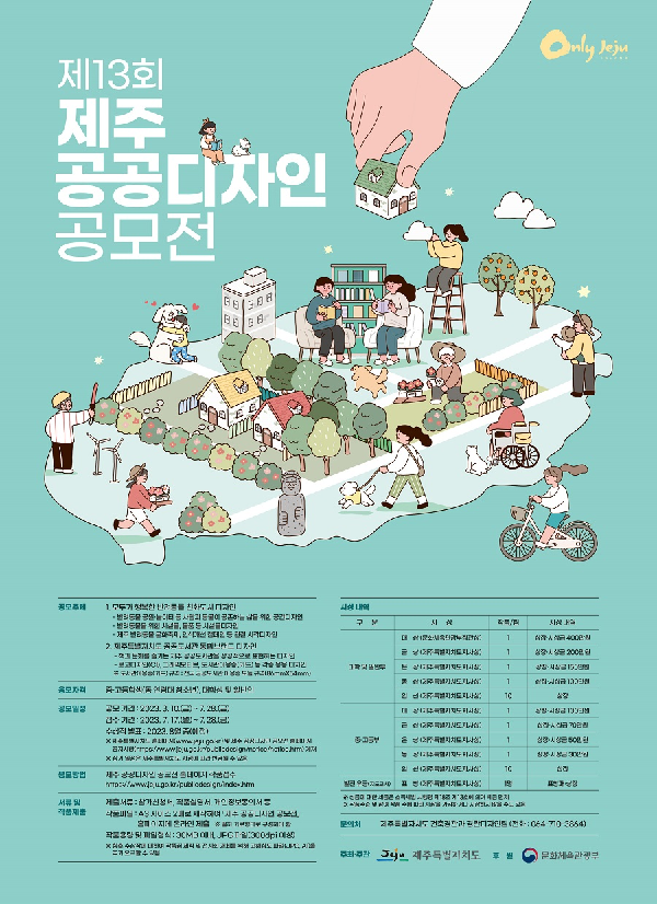 제13회 제주 공공디자인 공모전 ♣공모주제 1) 모두가 행복한 반려동물 친화도시 디자인 - 반려동물 공원․놀이터 등 사람과 동물이 공존하는 삶을 위한 공간디자인 - 반려동물을 위한 시설물, 물품 등 시설물디자인 - 제주 반려동물 문화축제, 인식개선 캠페인 등 관련 시각디자인 2) 제주특별자치도 공공도서관 통합브랜드 디자인 - 책과 문화를 즐기는 제주 공공도서관을 상징적으로 표현하는 디자인 - 로고디자인(CI), 그래픽모티브, 도서관이용증(카드) 등 각종 응용 디자인 ※ 도서관이용증(카드) 규격: 전국 공공도서관 이용증 모듈 규격(86mmX54mm) ♣공모부분 1) 공간 디자인 분야 2) 시설물 디자인 분야 3) 시각 디자인 분야 ♣응모자격 중·고등학생(동 연령대 청소년), 대학생 및 일반인 ♣출 품 료 없음 ♣공모일정 1) 공모 기간: 2023. 3. 10.(금) \~ 7. 28.(금) 2) 접수 기간: 2023. 7. 17.(월) \~ 7. 28.(금) 3) 수상작 발표: 2023. 8월 중(예정) ♣응모방법 1) 제주 공공디자인 공모전 홈페이지 작품접수 2) 제출서류 및 작품제출 • 제출서류: 참가신청서, 작품설명서, 개인정보동의서 등 • 작품파일: A3 사이즈 2매로 제작하여「제주 공공디자인 공모전」홈페이지에 온라인 제출 ♣시상내역 1) 대학 및 일반부 - 대상 : 1점, 상장․시상금 400만원 - 금상 : 1점, 상장․시상금 200만원 - 은상 : 1점, 상장․시상금 150만원 - 동상 : 1점, 상장․시상금 100만원 - 입선 : 10점, 상장 2) 중․고등부 - 대상 : 1점, 상장․시상금 100만원 - 금상 : 1점, 상장․시상금 70만원 - 은상 : 1점, 상장․시상금 50만원 - 동상 : 1점, 상장․시상금 30만원 - 입선 : 10점, 상장 3) 발전 유공(지도교사) - 표창 : 1명, 표창패․상장 ♣주최․주관 제주특별자치도 ♣문의 담당자 : 064-710-3864, 팩스 : 064-710-2749