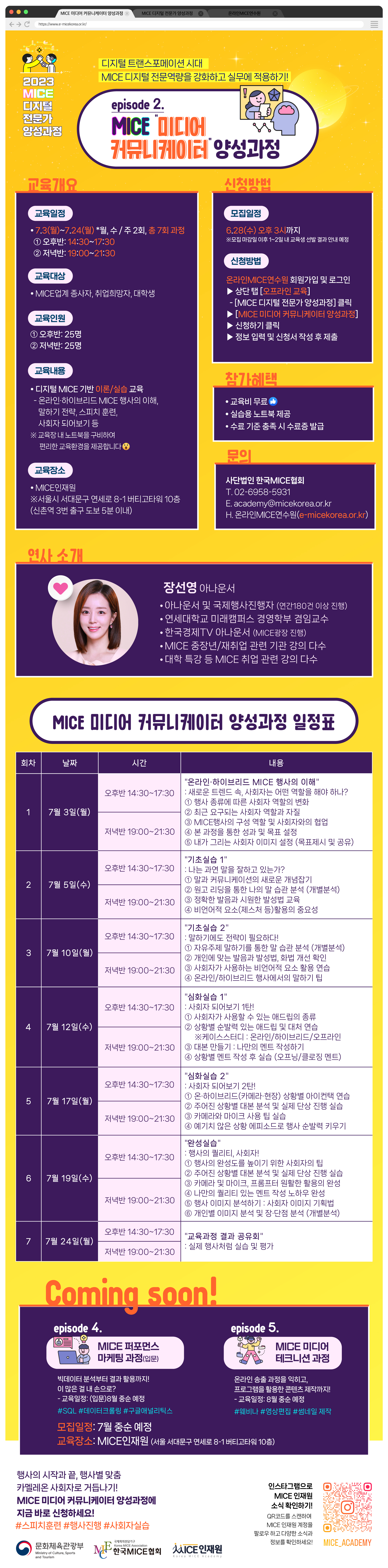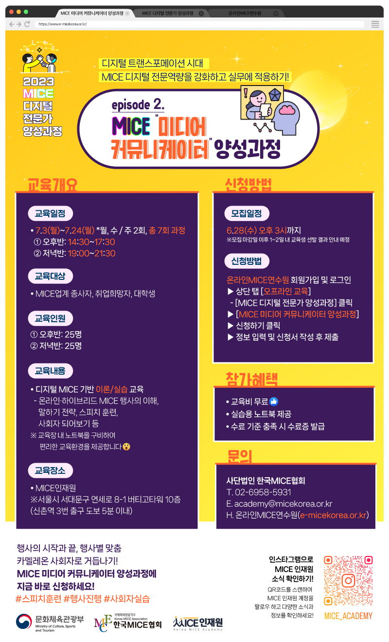 MICE 미디어 커뮤니케이터 양성과정 교육생 모집(\~6/28) 디지털 트랜스포메이션 시대, MICE 디지털 전문역량을 강화하고 실무에 적용하기! 2023 MICE 디지털 전문가 양성과정 "2번째 episode" 행사의 시작과 끝, 행사별 맞춤 카멜레온 사회자로 거듭나기! "MICE 미디어 커뮤니케이터 양성과정"에 지금 바로 신청하세요! ▶교육개요 *모집대상: MICE 업계 종사자, 취업희망자 및 대학생 *교육일정: 2023년 7월 3일(월) \~ 7월 24일(월) ※월, 수 / 주 2회, 총 7회 과정 *교육시간: ①오후반: 14:30\~17:30 / ②저녁반: 19:00\~21:30 *교육장소: MICE인재원(서울시 서대문구 연세로 8-1 버티고타워 10층) ※신촌역 3번 출구 도보 5분 이내 *교육내용: 디지털 MICE 기반 이론/실습 교육 ※온라인·하이브리드MICE 행사의 이해, 말하기 전략 및 스피치 훈련, 사회자 되어보기 등 ※교육장 내 노트북을 구비하여 편리한 교육환경 제공 *교육비: 무료 ▶신청방법 *신청기간: 2023년 6월 28일(수) 오후 3시까지 ※모집 마감일 이후 1\~2일 내 교육생 선발 결과 안내 예정 *신청방법 ①온라인MICE연수원 회원가입 및 로그인(www.e-micekorea.or.kr) ②상단 탭[오프라인 교육] - [MICE 디지털 전문가 양성과정] 클릭 ③[MICE 미디어 커뮤니케이터 양성과정] 신청하기 클릭! ④정보 입력 및 신청서 작성 후 제출 *문의: 02-6958-5931