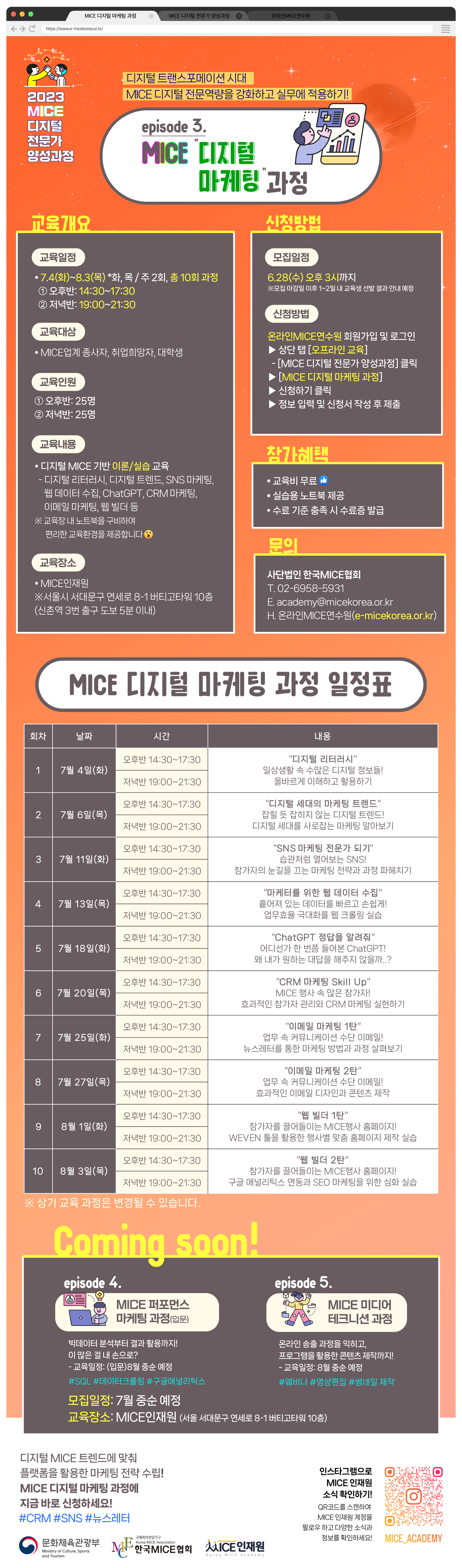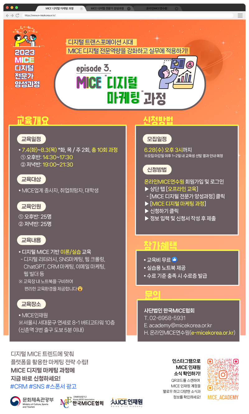 MICE 디지털 마케팅 과정 교육생 모집(\~6/28) 디지털 트랜스포메이션 시대, MICE 디지털 전문역량을 강화하고 실무에 적용하기! 2023 MICE 디지털 전문가 양성과정 "3번째 episode" 디지털 MICE 트렌드에 맞춰 플랫폼을 활용한 마케팅 전략 수립! "MICE 디지털 마케팅 과정"에 지금 바로 신청하세요! ▶교육개요 *모집대상: MICE 업계 종사자, 취업희망자 및 대학생 *교육일정: 2023년 7월 4일(화) \~ 8월 3일(목) ※화, 목 / 주 2회, 총 10회 과정 *교육시간: ①오후반: 14:30\~17:30 / ②저녁반: 19:00\~21:30 *교육장소: MICE인재원(서울시 서대문구 연세로 8-1 버티고타워 10층) ※신촌역 3번 출구 도보 5분 이내 *교육내용: 디지털 MICE 기반 이론/실습 교육 ※디지털 리터러시, SNS 마케팅, ChatGPT, CRM 마케팅 등 ※교육장 내 노트북을 구비하여 편리한 교육환경 제공 *교육비: 무료 ▶신청방법 *신청기간: 2023년 6월 28일(수) 오후 3시까지 ※모집 마감일 이후 1\~2일 내 교육생 선발 결과 안내 예정 *신청방법 ①온라인MICE연수원 회원가입 및 로그인(www.e-micekorea.or.kr) ②상단 탭[오프라인 교육] - [MICE 디지털 전문가 양성과정] 클릭 ③[MICE 디지털 마케팅 과정] 신청하기 클릭! ④정보 입력 및 신청서 작성 후 제출 *문의: 02-6958-5931