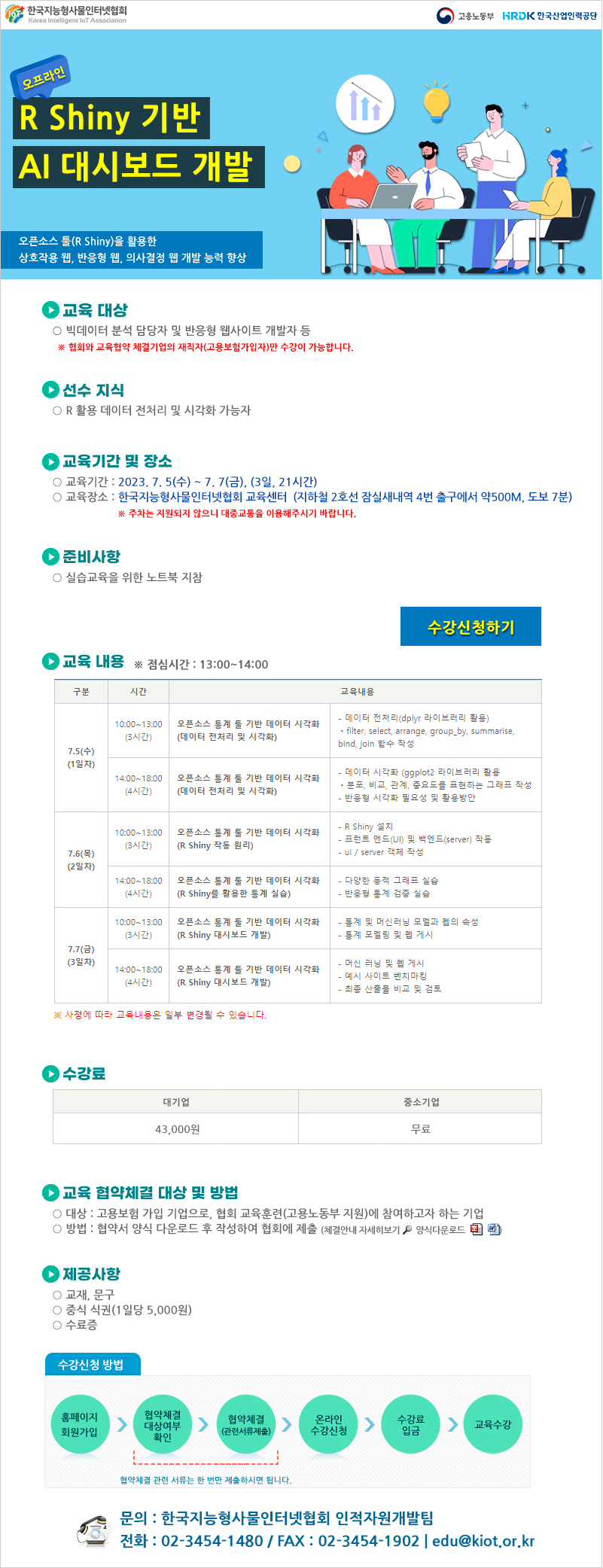 ■ 교육 목표 : 오픈소스 툴(R Shiny)을 활용한 상호작용 웹, 반응형 웹, 의사결정 웹 개발 능력 향상 ■ 교육 대상 : 빅데이터 분석 담당자 및 반응형 웹사이트 개발자 등 ■ 교육 기간 : 2023. 7. 5(수) \~ 7(금) ■ 교육 장소 : 한국지능형사물인터넷협회 ■ 준비사항 : 실습교육을 위한 노트북 지참 ■ 수강료 : (중소기업 재직자) 무료 / (대기업 재직자) 43,000원