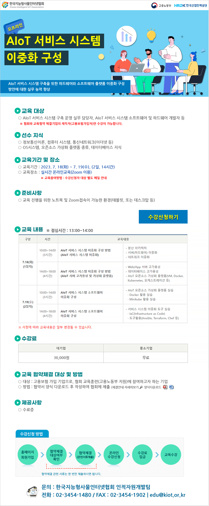 ■ 교육 목표 : AIoT 서비스 시스템 구축을 위한 하드웨어와 소프트웨어 플랫폼 이중화 구성 ■ 교육 대상 : AIoT 서비스 시스템 구축 운영 실무 담당자, AIoT 서비스 시스템 소프트웨어 및 하드웨어 개발자 등 ■ 교육 기간 : 2023. 7. 18(화) \~ 19(수) ■ 교육 장소 : ZOOM ■ 준비사항 : 실습교육을 위한 노트북 지참 ■ 수강료 : (중소기업 재직자) 무료 / (대기업 재직자) 30,000원