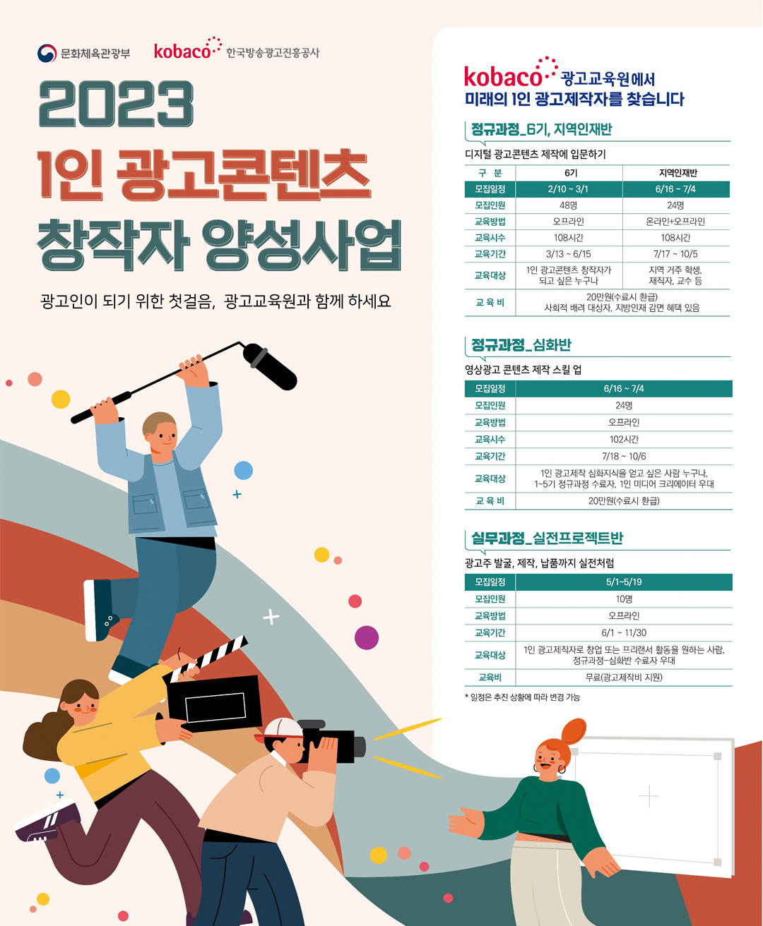 안녕하세요? 코바코 광고교육원에서 광고제작 스킬을 좀 더 발전시키고자 하는 심화반 수강생을 모집합니다. 광고콘텐츠 수요가 많은 뷰티, 패션, 푸드 분야의 광고제작을 레벨업시킬 수 있는 좋은 기회, 심화반 과정에 많은 신청 부탁드립니다. 수강생 모집은 7월 4일까지. 자세한 내용은 광고교육원 홈페이지 공지사항을 참조해 주세요.